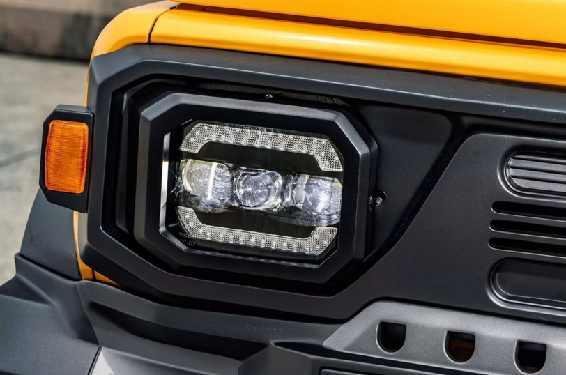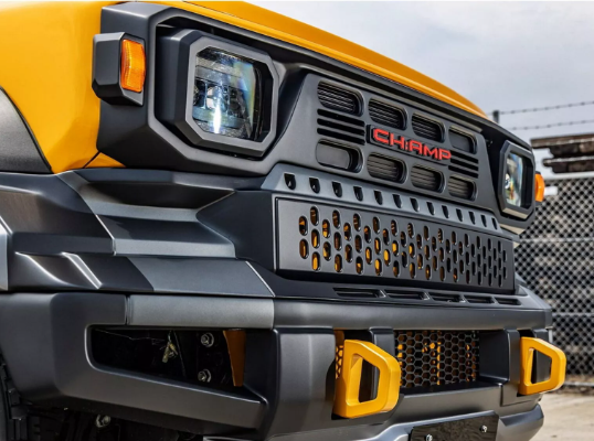 В комплект входить решітка радіатора в стилі Hilux Champ з прямокутними фарами, масивний передній двосекційний бампер з безліччю отворів, який перегукується з дизайном Toyota Land Cruiser FJ. Кожен компонент пофарбований у чорний колір, доповнюючи широкі крила і контрастний дах. Встановлені ще занижують на 38 мм дорожній просвіт пружини і бутафорські буксирувальні гаки.