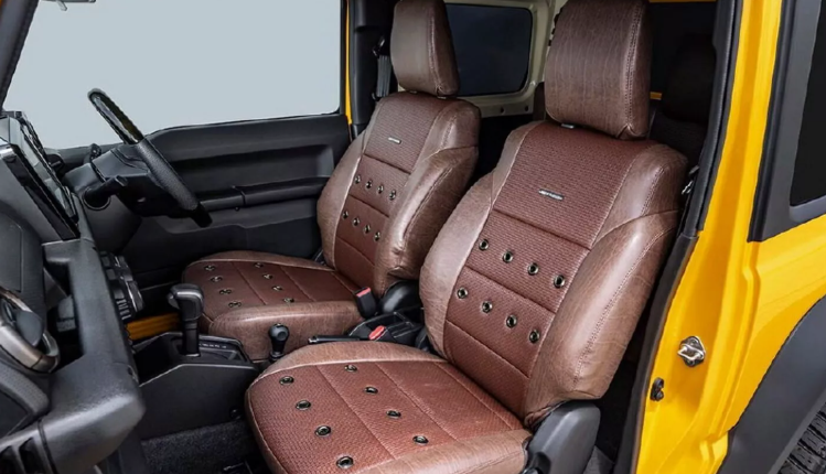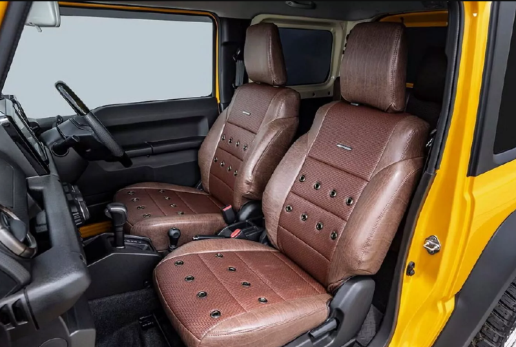 У салоні змін менше. Тюнер обмежився чохлами на сидіння в ретро-стилі коньячно-коричневого або вугільно-чорного кольору, що поєднують шкіру з плетеними вставками і задніми кишенями для зберігання дрібниць. Якби не яскраво-червона напис CH:AMP, то Jimny цілком міг би зійти за Toyota.