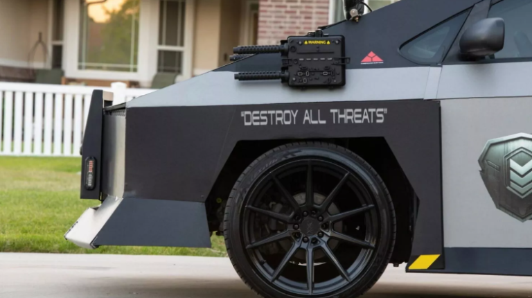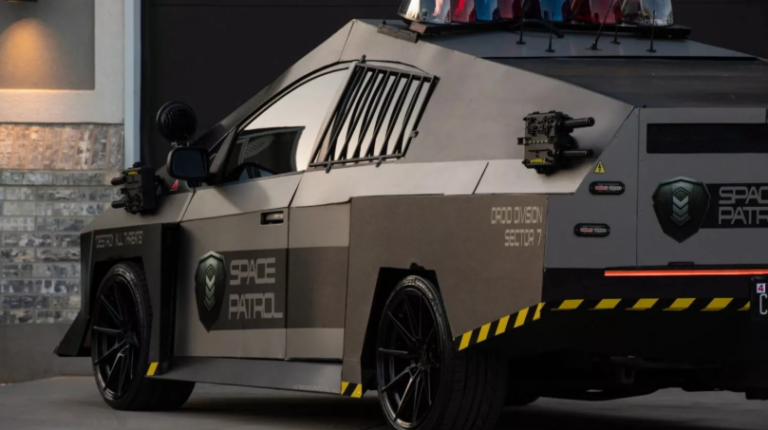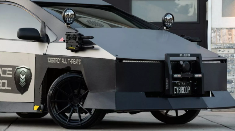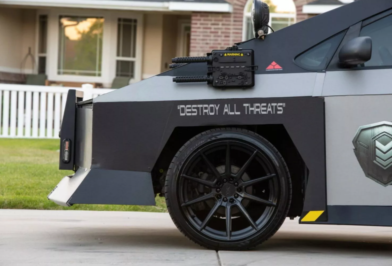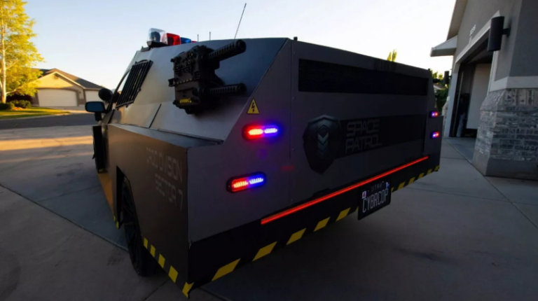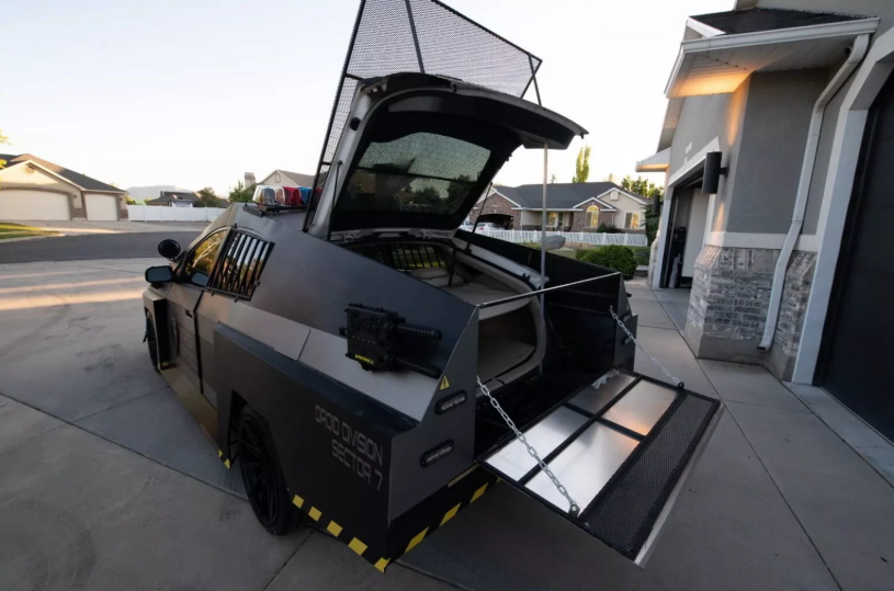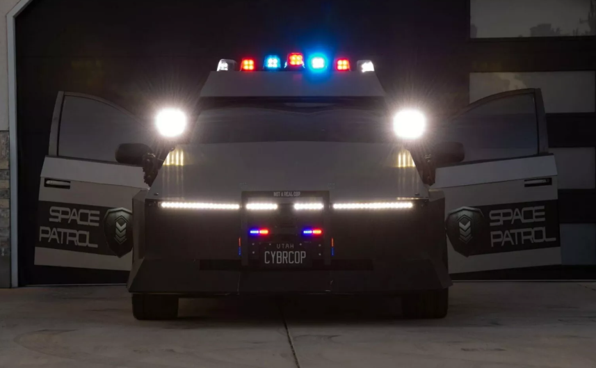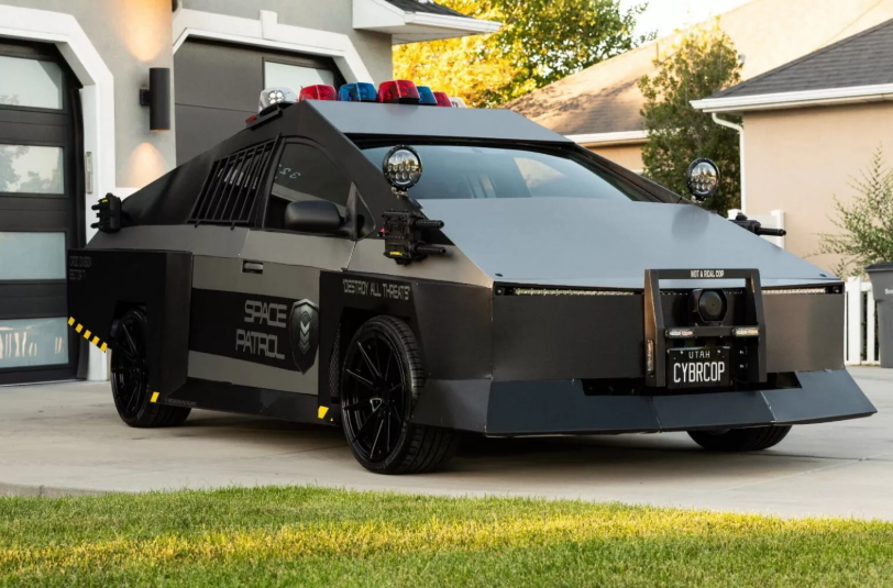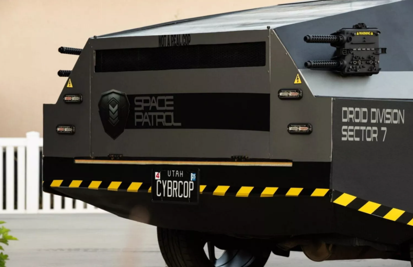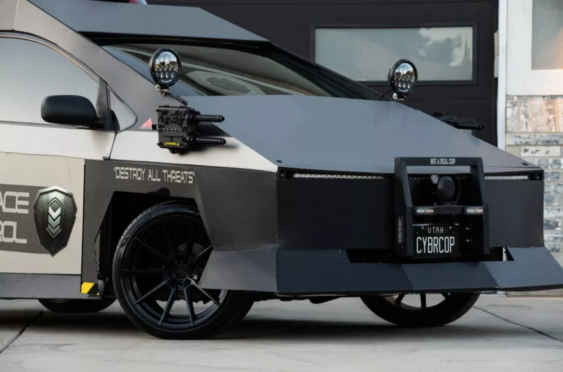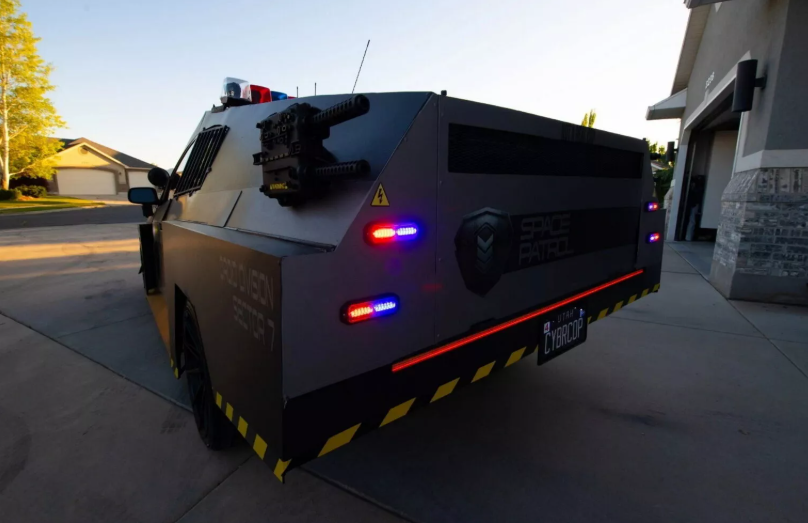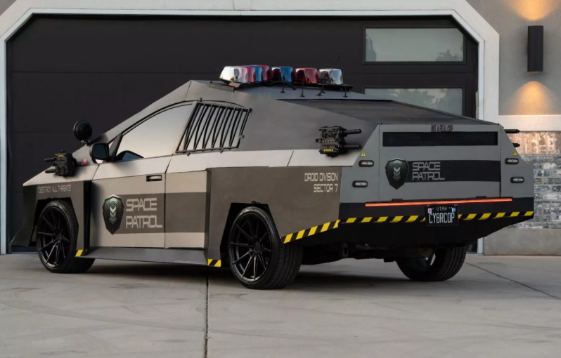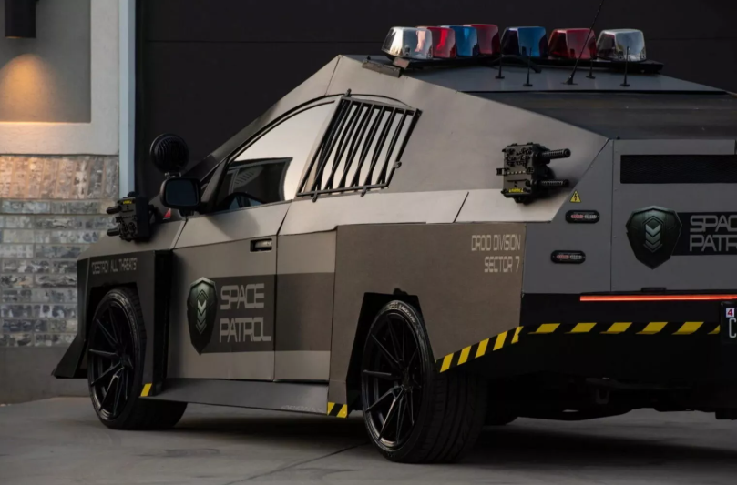Скло та дзеркала на імпровізований пікап, який назвали Cybercop, встановили оригінальні від Toyota. Тонкі світлодіодні смуги зайняли місце фар та задніх ліхтарів. Пофарбували авто в сірий матовий відтінок. Його доповнюють наклейки «Space Patrol» і «Not A Cop Car», імпровізовану зброю з боків, стробоскопи на даху і проблискові маячки попереду. Завершують образ чорні литі диски.