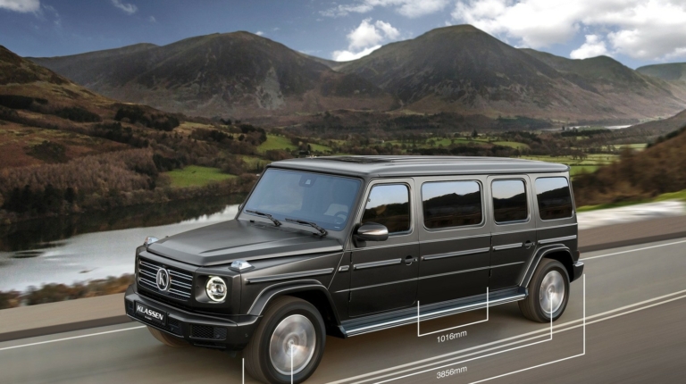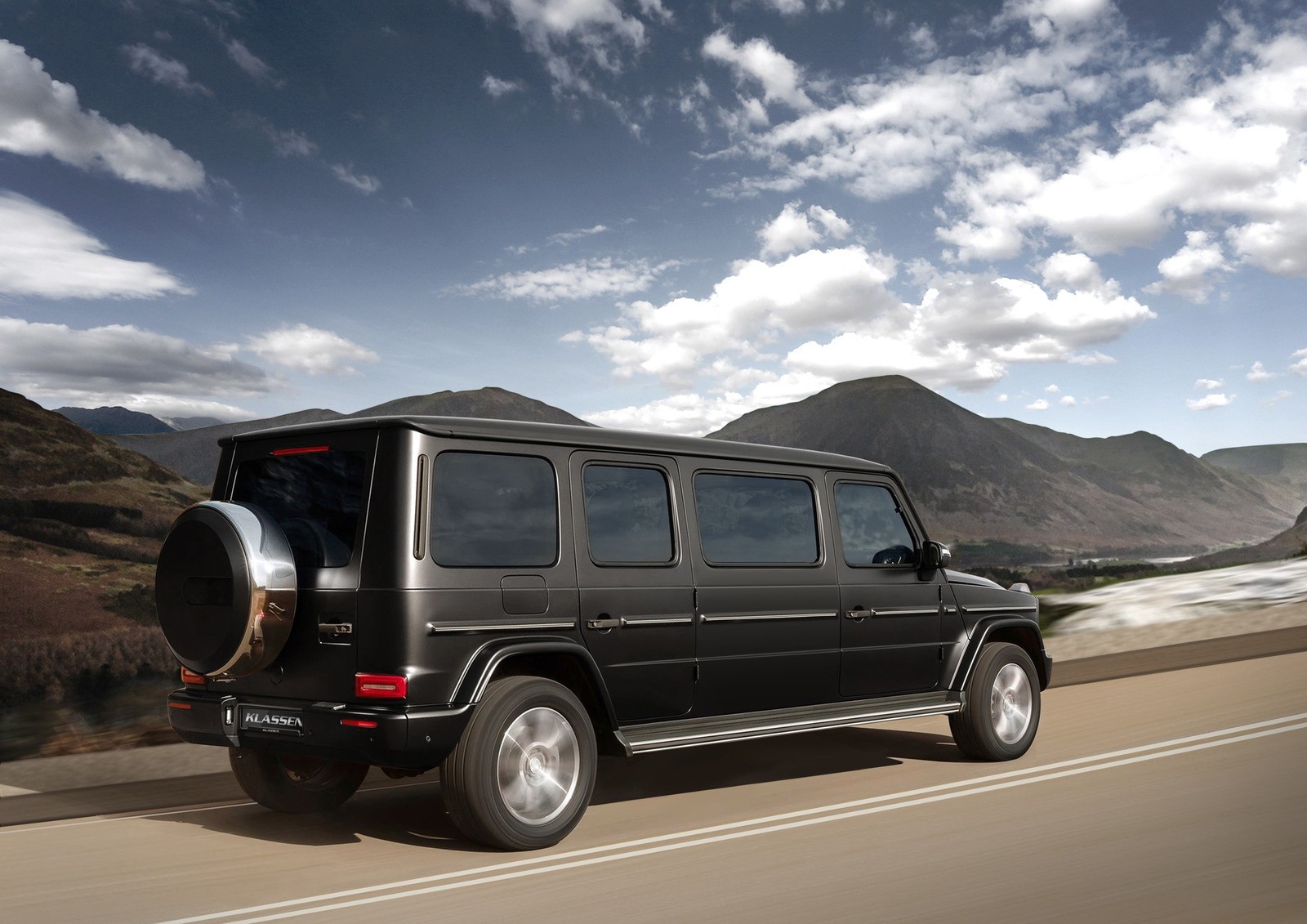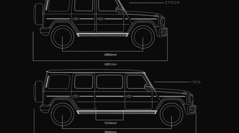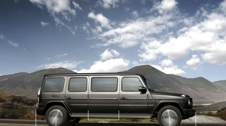 Фахівці ательє перетворили автомобіль на справжній лімузин, збільшивши його колісну базу на 1016 мм. І тепер вона становить 3906 мм, а загальна довжина машини – 5897 мм. Щоб досягти такого результату, вони розрізали Гелендваген навпіл і вставили між передніми та задніми дверима додаткову секцію з вікнами.