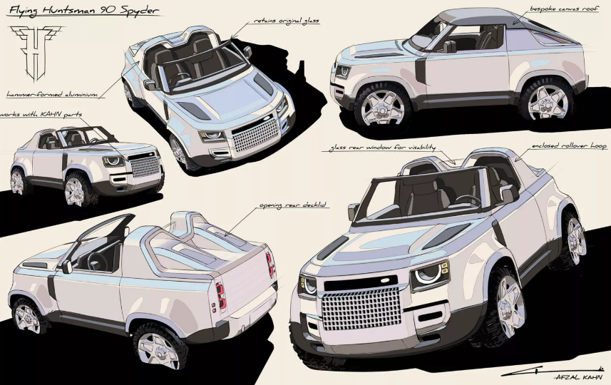 Проект отримав назву Flying Huntsman 90 Spyder. Позашляховик із чотиримісного став двомісним. Його кузов виготовлений із легкого алюмінію класу NS3. Панелі спеціалісти ательє формували вручну. Знімний дах виготовлений з брезента. За спинками сидінь встановлені обтічники.