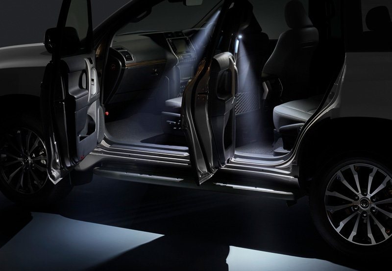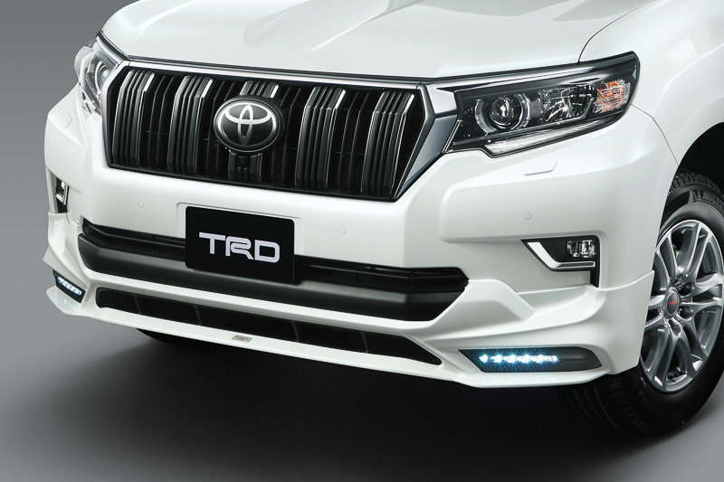 Тюнинг Тойота Прадо от TRD более скромный. Он включает новые бамперы, светодиодные противотуманки и легкосплавные диски диаметром 17 и 18 дюймов. В салон можно выбрать красную кнопку запуска двигателя. Цена набора 268 тыс. иен ($2500).