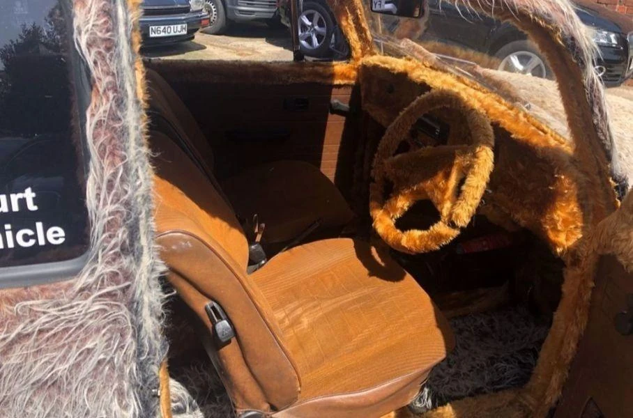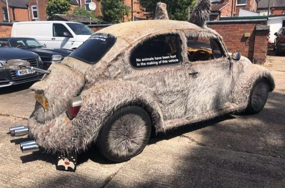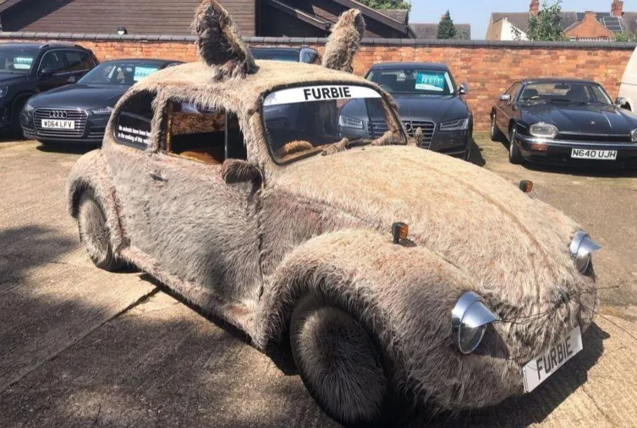 Столь высокую цену за свой мохнатый Volkswagen владелец запросил за стильный образ. Кузов автомобиля полностью покрыт искусственным мехом. На крыше торчит пара ушей, на месте радиаторной решетки – усы, как и у его игрушечного «прототипа» - говорящей игрушки Furby, появившейся на прилавках американских магазинов в рождественский сезон 1998 года. Мехом покрыты корпуса боковых зеркал и колесные диски. В салоне – меховое рулевое колесо, передняя панель и напольные коврики. На корме торчит огромный ключ, как у заводной механической игрушки. Из-под заднего бампера видны две пары патрубков выхлопной системы.