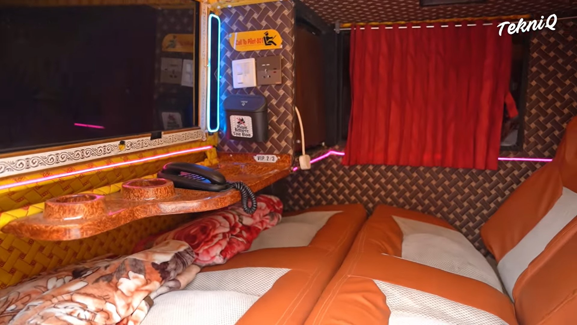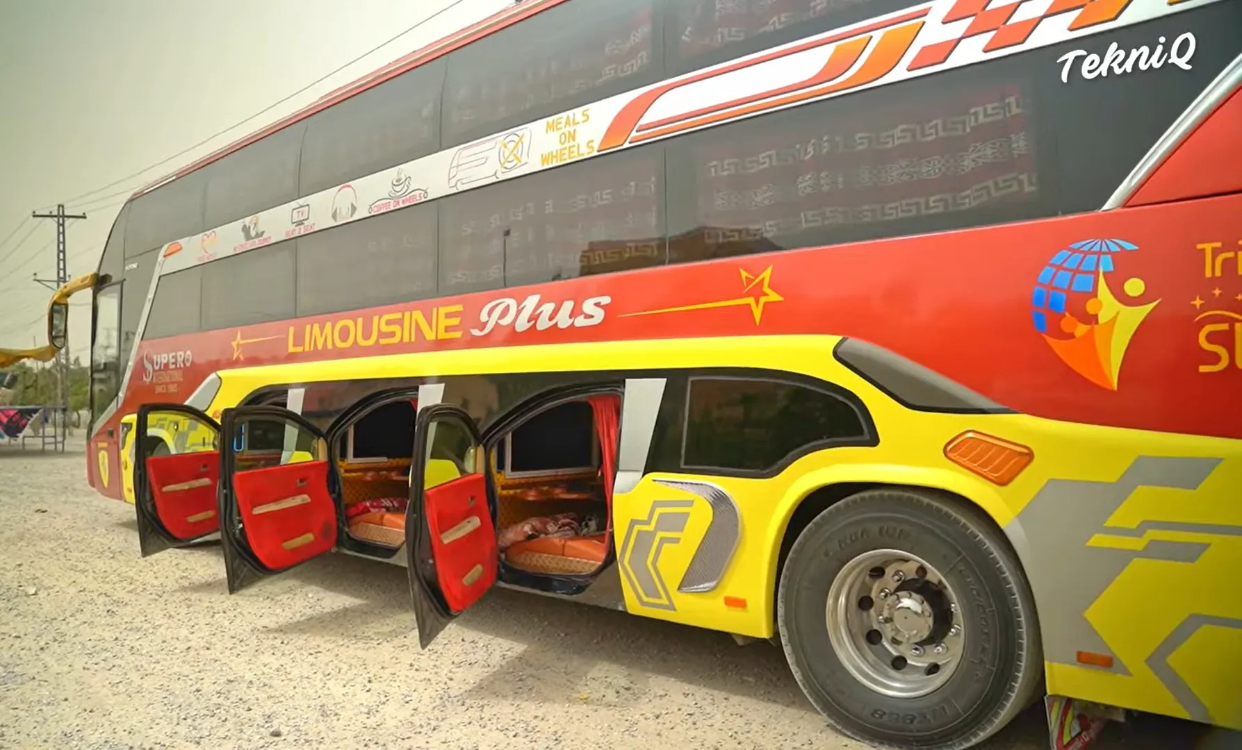 Що ж до основного салону автобуса, то він виконаний у вигляді двоярусних відсіків, де пасажири розміщуються напівлежачи. Є двомісні місця, а є й одномісні. Рівень комфорту тут також на висоті: шкіряні крісла, плоский телевізор (щоправда, меншого розміру, ніж у VIP-відсіках), великі навушники, USB-роз’єми. В основі пакистанського лайнера лежить автобус марки Foton, причому в досить поширеному на китайському ринку спальному виконанні.