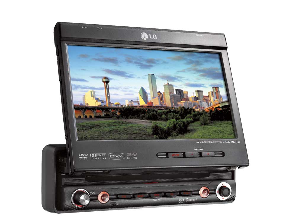 Стильная передняя панель, дизайн которой LG Electronics позиционирует как спортивный, имеет съемную часть, что на сегодняшний день не так часто встречается среди мультимедийных устройств с выдвижным 7-дюймовым экраном. В духе современных веяний касательно безопасности движения LG LAD9700R предлагает систему громкой связи Bluetooth для мобильного телефона и возможность демонстрации на экране картинки с камеры заднего вида.