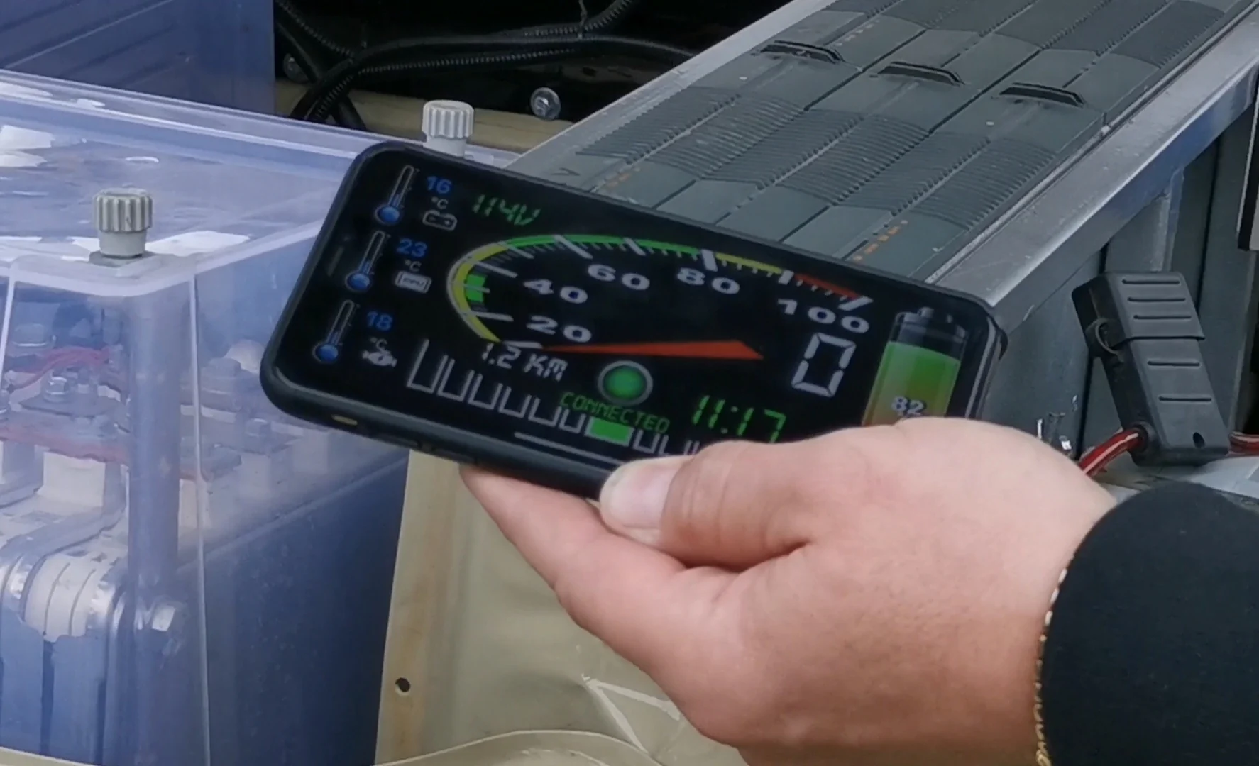 И самое интересное, что отличает этот автомобиль от других самоделок. Здесь есть компьютер, который генерирует Wi-Fi-cигнал и через него передаётся информация о работе систем автомобиля. Когда водитель заводит автомобиль он загружает мобильное приложение и на смартфон высвечивается различные параметры.