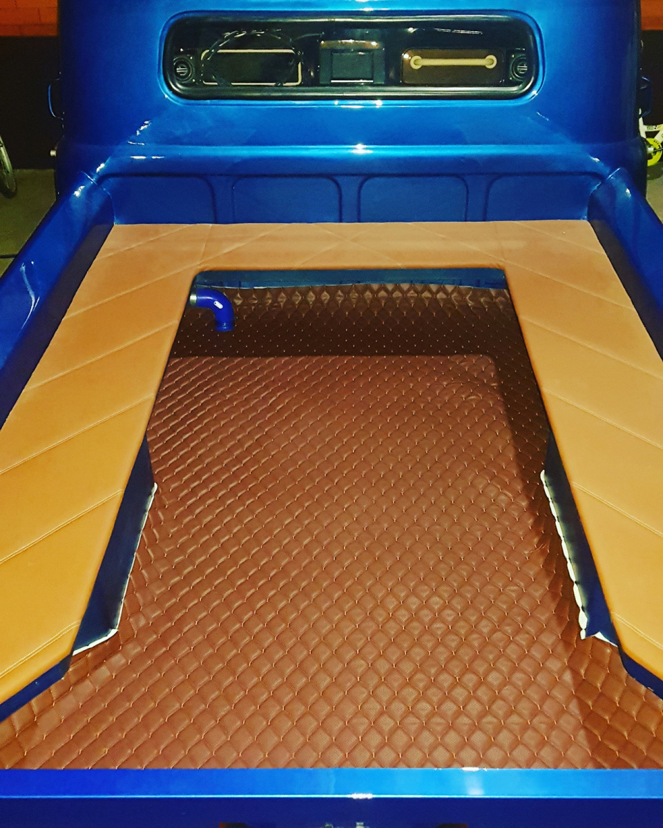Почнемо не з кабіни водія, а з відкритої вантажної платформи, яку перетворили на комфортабельний пасажирський відсік. Лавки вздовж бортів обтягнули шкірою, шкіра є і на підлозі – причому не звичайна, а надміцна, яхтова.