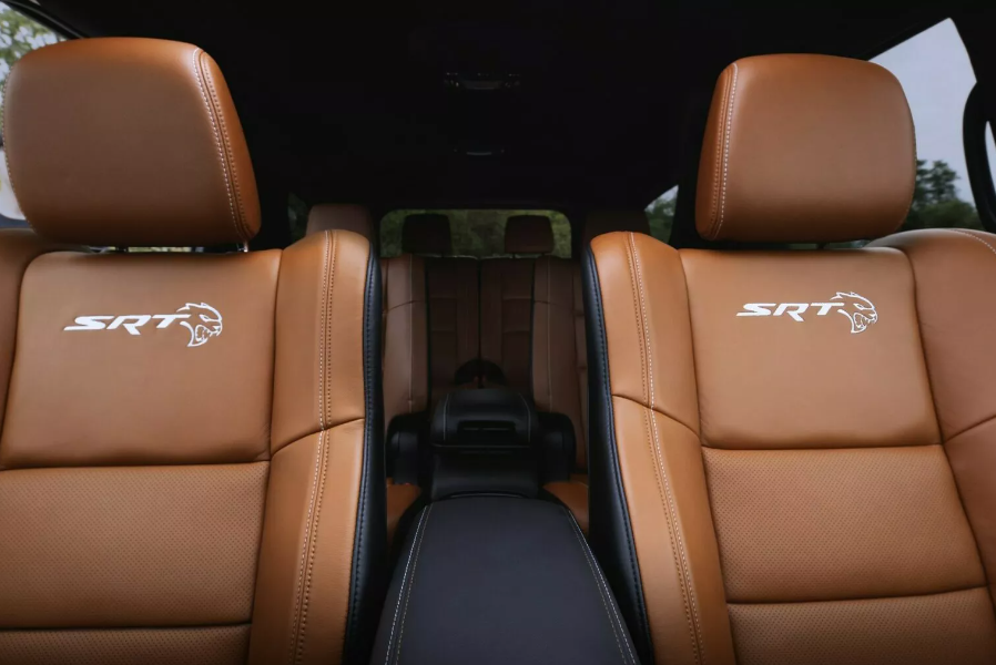 Оздоблення кабіни виконали зі шкіри Sepia Laguna коньячного та чорного кольору. На спинках сидінь вишиті логотипи SRT Hellcat. Рульове колесо спецверсії отримало оплетку зі шкіри та замші. Як акценти служать вставки з кованого вуглецевого волокна і темного хрому.