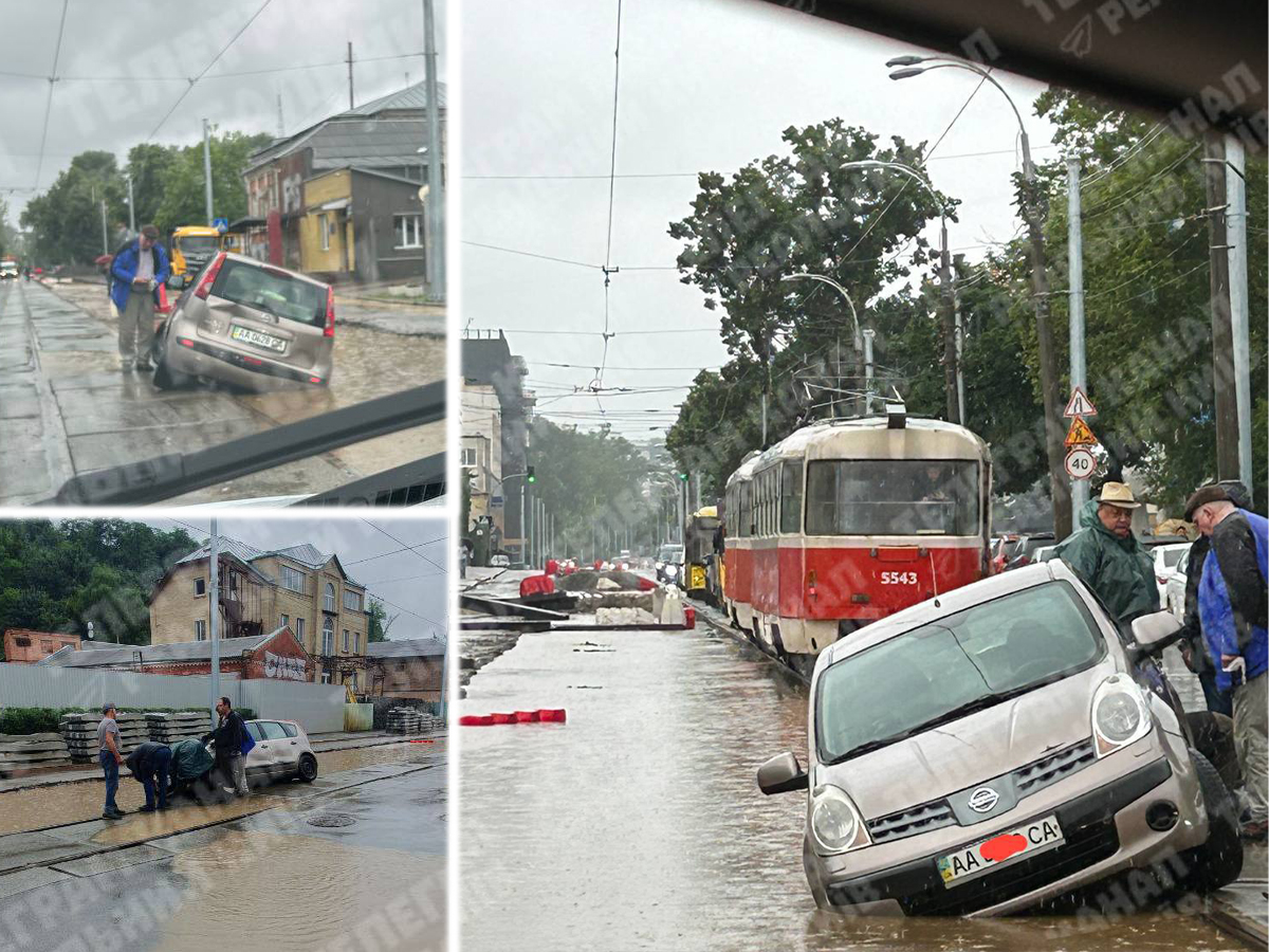 Через негоду в столиці значно ускладнено рух транспорту через численні аварії та підтоплення. Так, на вул. Кирилівській легковик вʼїхав у глибоку яму, що лишилась на місці дорожніх робіт. Очевидці зазначають, що яма там глибиною близько пів метра, зараз там після затяжної зливи – вода.