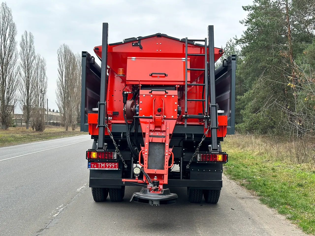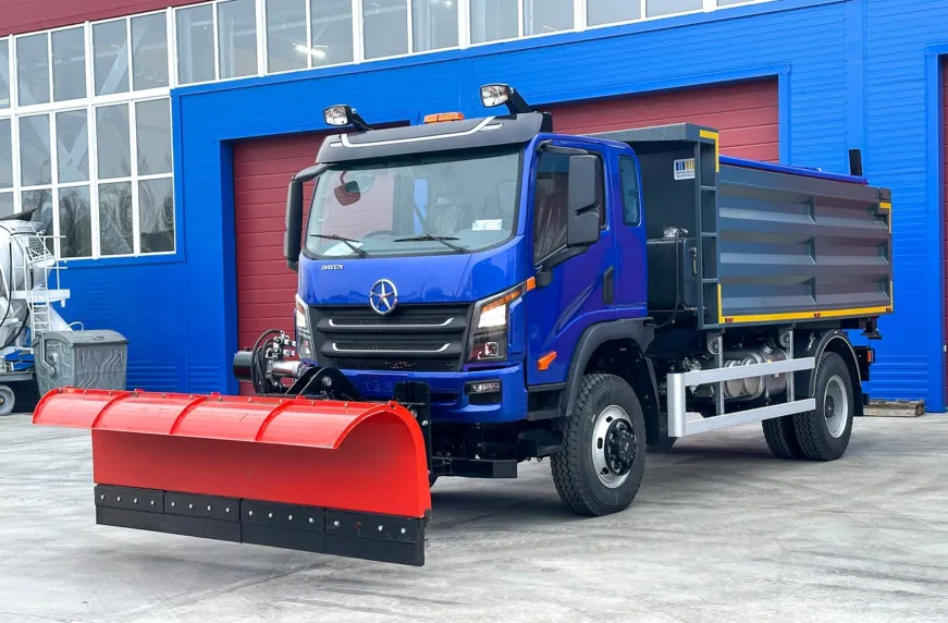 У передній частині встановлений снігоочисний відвал завширшки 2,7 м та кутом повороту до 30 град. Важливо, що гідропривід забезпечується від автономної маслостанції на 2,2 кВт. Все обладнання має керування з кабіни водія. Піскосолерозкидувач та бункер можна легко демонтувати, без необхідності залучення автокрана, та використовувати комбіновану дорожню машину як традиційний самоскид.