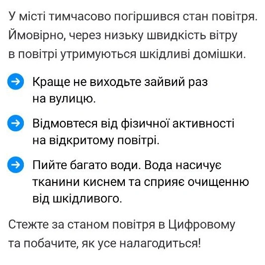 Станом на 16:00 16 липня рівень забрудненості атмосферного повітря в Києві високий. Ймовірною причиною тимчасового погіршення стану повітря є метеорологічні умови (зокрема, дуже низька швидкість вітру), що сприяють накопиченню та утриманню шкідливих домішок у приземному шарі повітря. Про це повідомляє Департамент захисту довкілля та адаптації до зміни клімату КМДА.