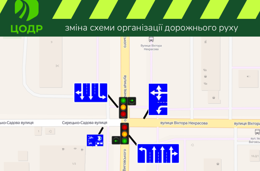 У «Центрі організації дорожнього руху» звертають увагу водіїв, що для поворотів ліворуч на вул. Івана Виговського впроваджено додаткові окремі смуги, а лівоповоротні маневри дозволені лише на зелене світло додаткової секції світлофора зі стрілкою ліворуч.