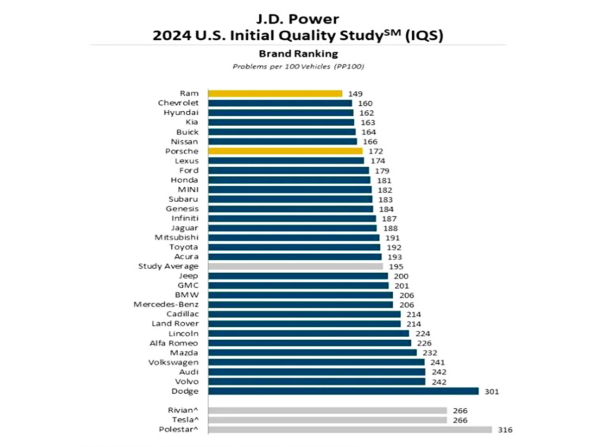 Серед усіх брендів найкращих показників досяг Ram, який набрав всього 149 балів. Друге місце посідає Chevrolet – 160 балів, а третє у Hyundai – 162 бали.