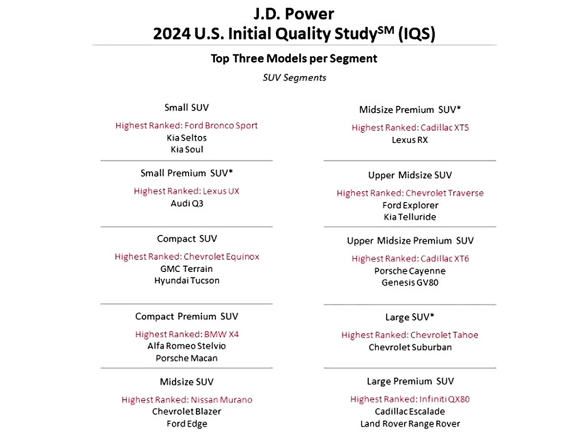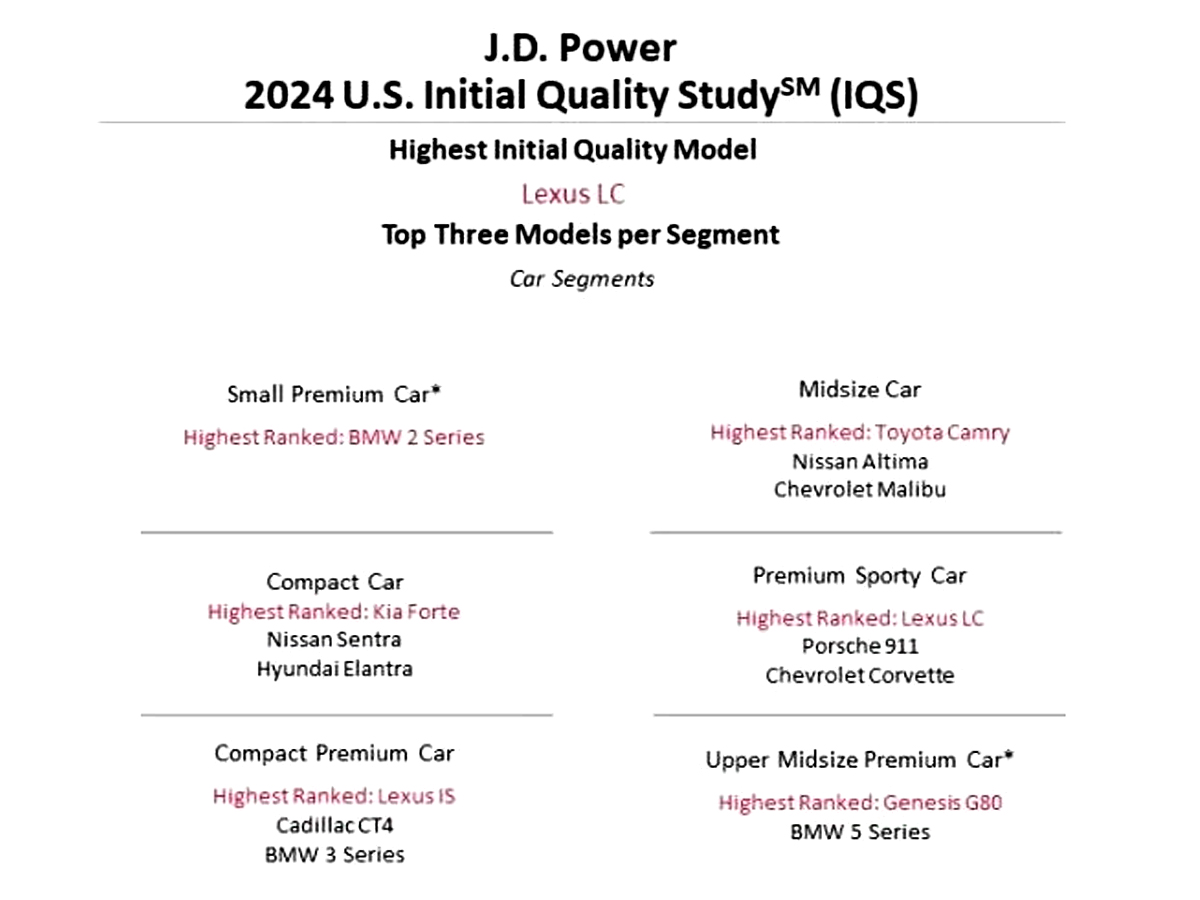 Це дослідження якості в США проводиться 38 років. Цього року основу рейтингу склало опитування майже 100 тисяч покупців та орендарів нових автомобілів 2024 модельного року, які користувалися своїми машинами не менше 90 днів. Вперше до дослідження додатково включені дані про ремонти та випадки звернення на сервіс.