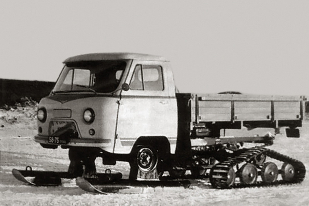 – В конце 1960 года началась работа над снегоходным автомобилем УАЗ-451С, который был укомплектован сменным сезонным оборудованием для преодоления снежного бездорожья и целины. Вместо передних колес у него устанавливались металлические управляемые лыжи, а вместо задних — резино-металлические гусеничные движители.