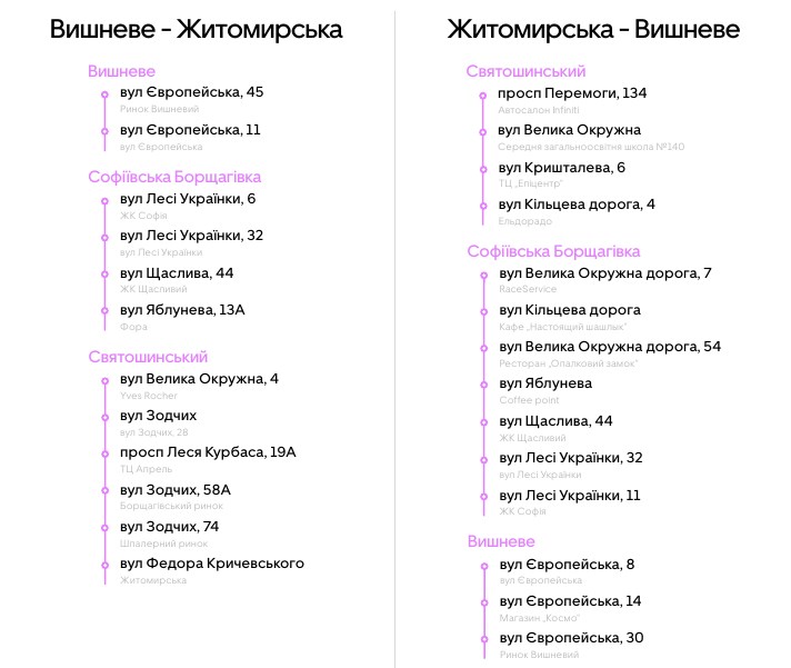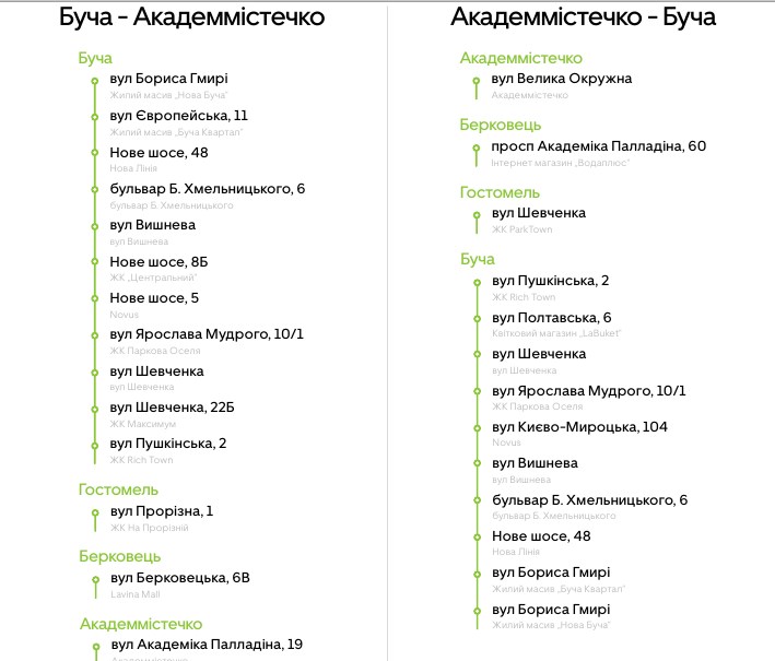 Маршруты будут организованы из Вишневого до станции метро “Житомирская” и обратно, а также из Бучи до станции метро “Академгородок” и обратно. Оба маршрута будут доступны с 7:00 до 21:00 в рабочие дни. Стоимость поездки будет рассчитываться исходя из километража. Ориентировочно она будет составлять 25-30 гривен.
