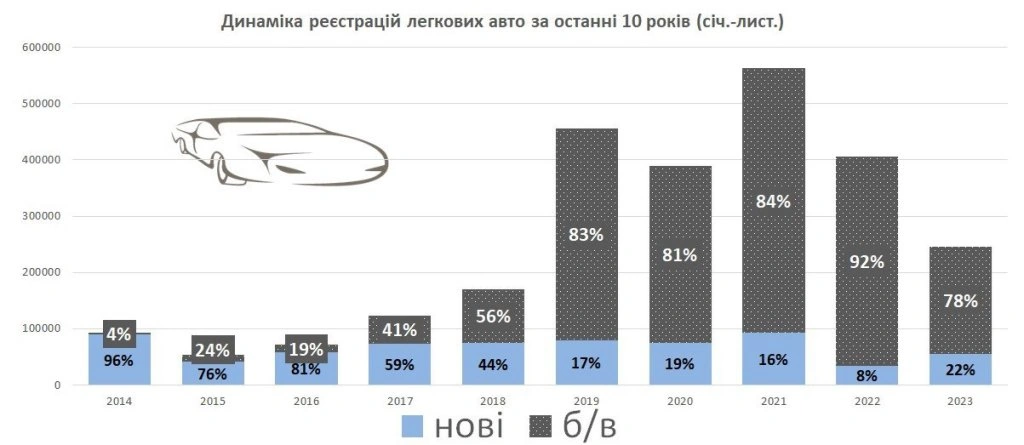 Середній вік машин, які вперше поставили на український облік у звітному періоді, становить 8,2 роки. А все тому, що частка уживаних легковиків у загальній кількості продажів цих 11 місяців склала 78%. Як повідомляє «Укравтопром», це не найбільший показник за останні 10 років. 2022-го він становив 92%.