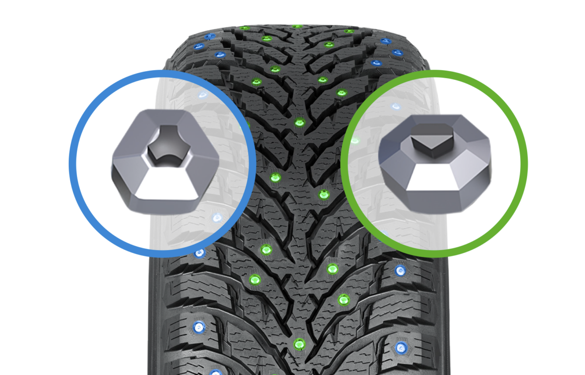 Шипы для центральной части протектора выполняют свою роль при торможении, ускорении и прохождении поворотов. А те, что расположены на плечевой части шины, «отвечают» за боковое сцепление на обледенелой и заснеженной поверхности.
