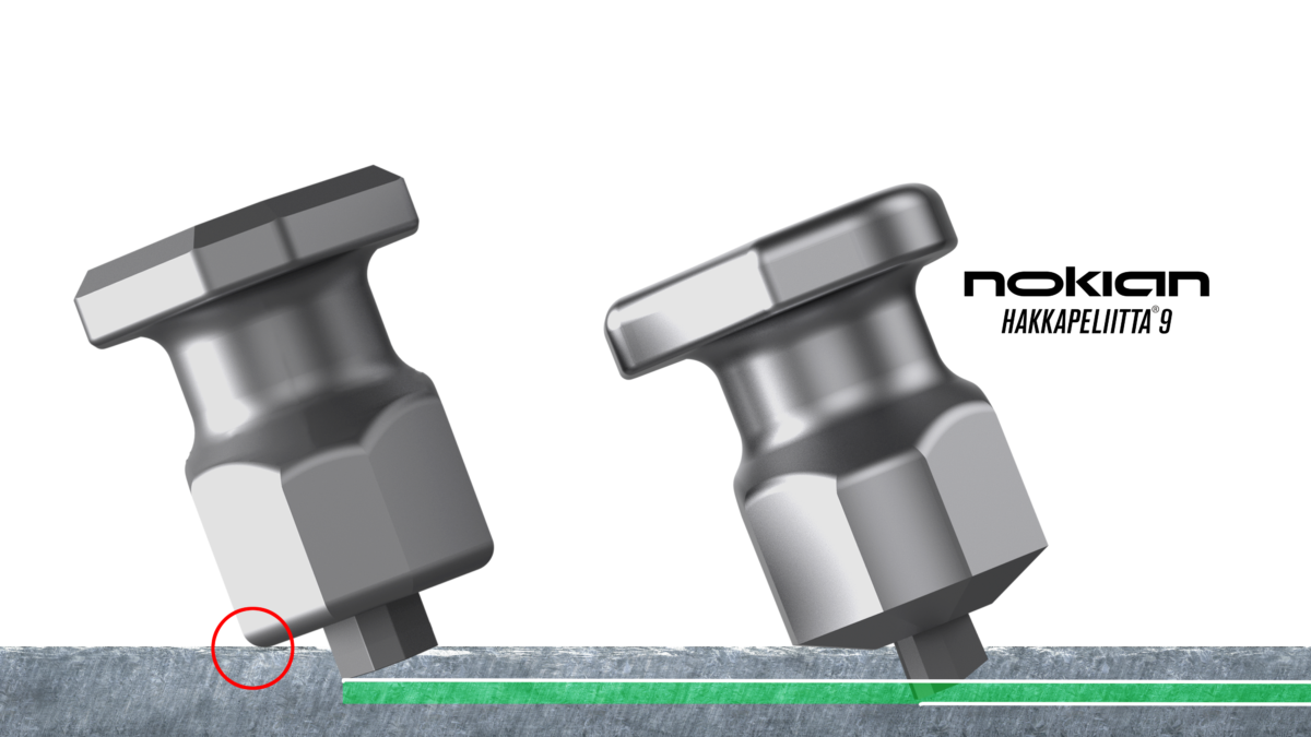 Фланцы у шипов на новой Хаккапелита 9 скошенные, а упираются они в специальную «подушку», которая мягче, чем основной слой протектора. Такое решение позволяет лучше «цепляться» шипом за лёд, а также уменьшить шум от шипов и отрицательное воздействие на дорогу.