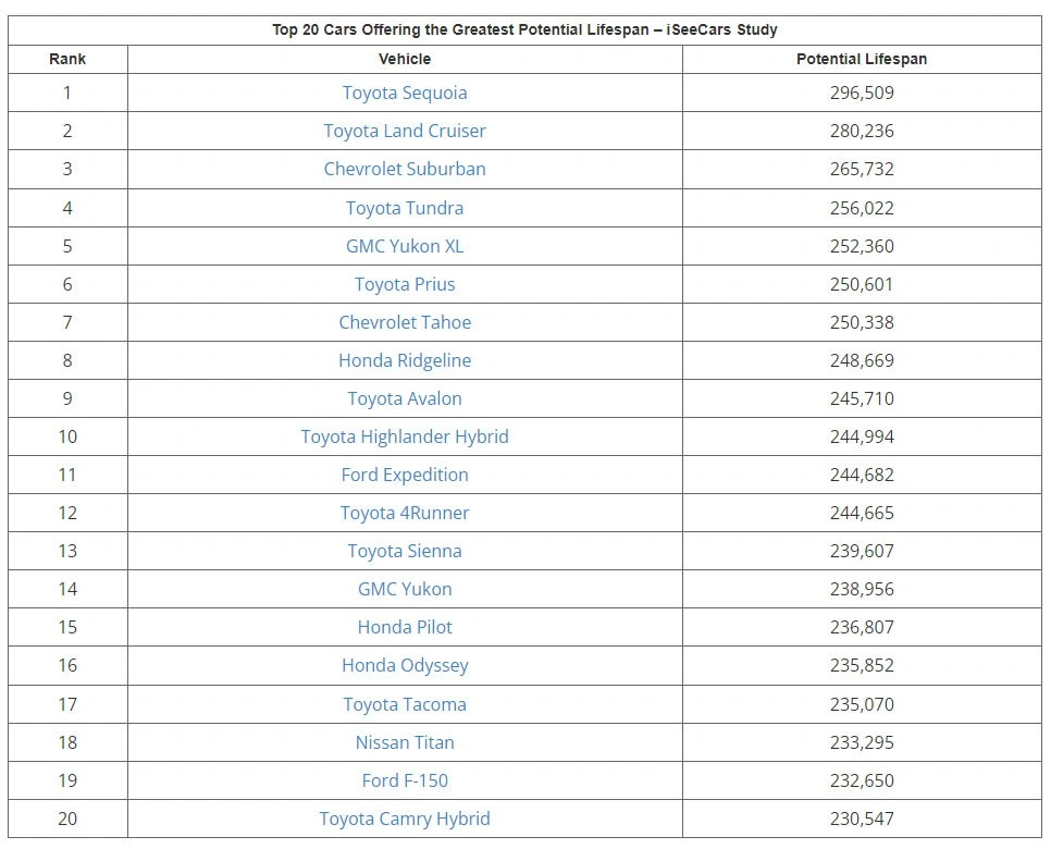 Усі машини ранжували та обчислили середній показник пробігу для кожної моделі. Лідером рейтингу надійності став позашляховик Toyota Sequoia. Близько 1% досліджених представників цієї моделі мали на одометрі пробіг понад 477 тисяч кілометрів. Також відмінний результат показали Toyota Land Cruiser (450 тис. км), Chevrolet Suburban (428 тис. км), Toyota Tundra (412 тис. км) та GMC Yukon XL (406 тис. км).