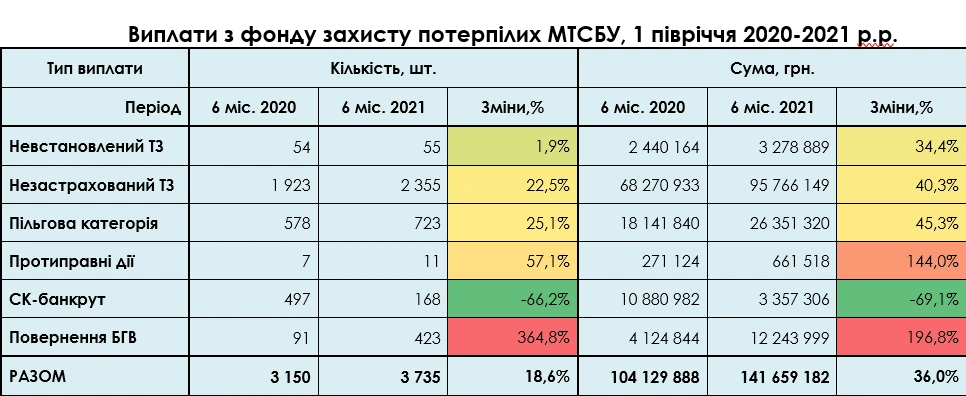 Так, за шість місяців 2021 року МТСБУ (моторне транспортне Страхове бюро України) здійснило 3700 виплат на загальну суму 141,7 млн гривень. Порівняно з аналогічним періодом минулого року кількість виплат зросла на 18,6%, а сума – на 36%. Найбільше виплат здійснено за шкоду, заподіяну власниками транспортних засобів, у яких на момент скоєння ДТП не було поліса ОСАЦВ. Кількість виплат за цією статтею становила 95,8 млн гривень (+40%).