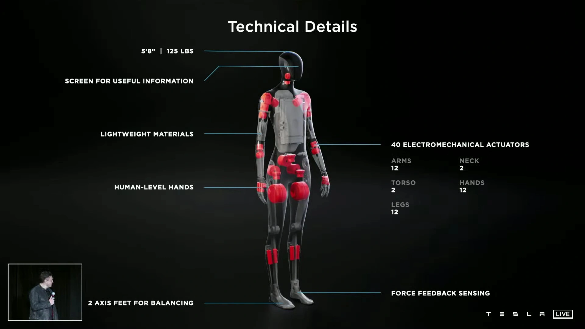 В его голове встроен экран, а движение будет осуществляться за счет 40 электромеханических приводов (по 12 в каждой руке и ноге, два в шее и два в туловище). По словам Макса, движения робота будут напоминать человеческие. Понимать людей он сможет за счет датчика распознания голоса, которые сейчас используют в электромобилях марки. С роботом можно будет не только поговорить, а и отправить в магазин за покупками или попросить помочь с домашними делами. Когда Tesla Bot поступит в продажу пока не известно. Глава компании не смог ответить на этот вопрос.