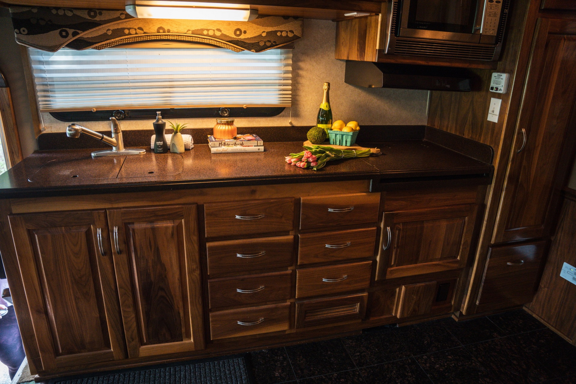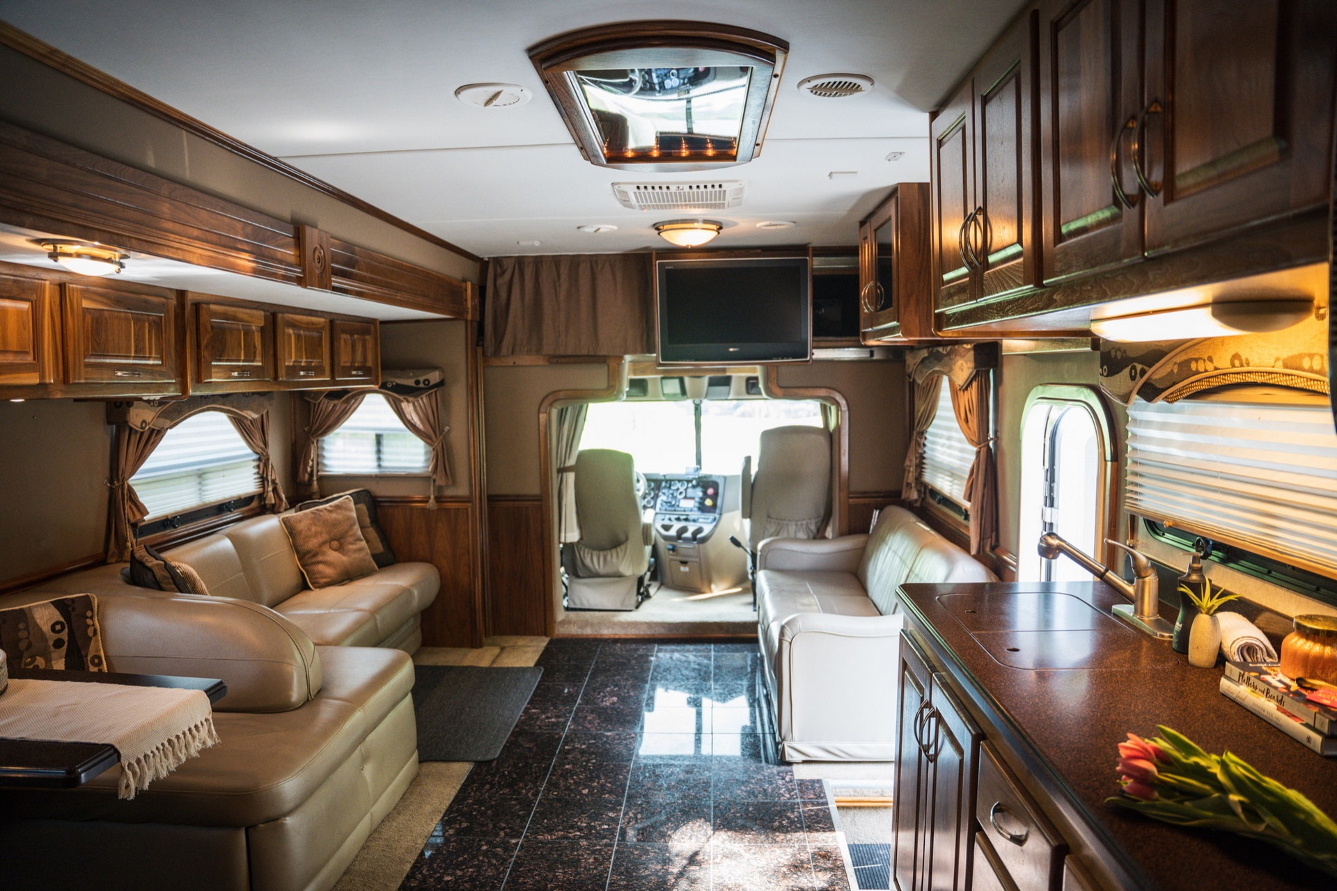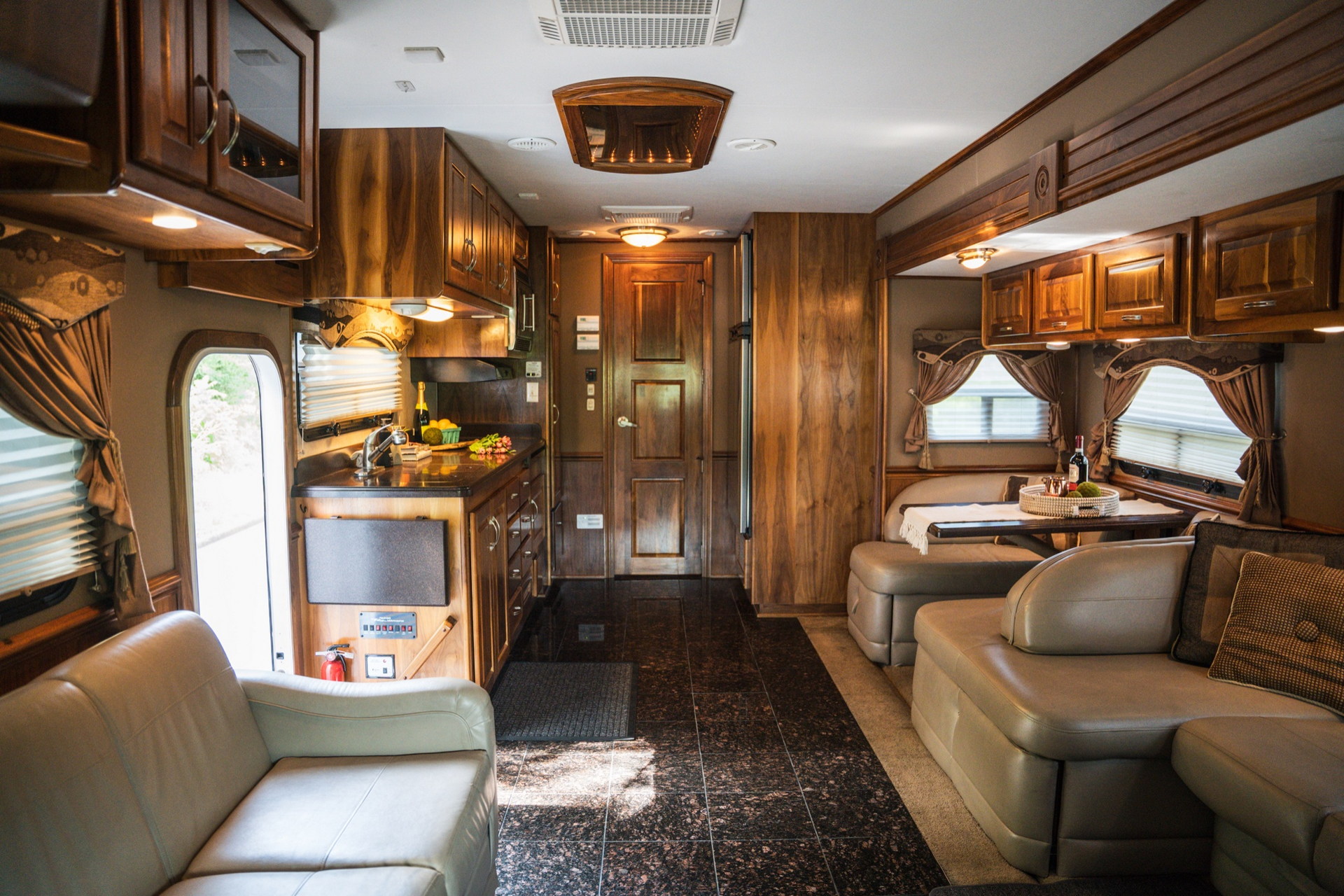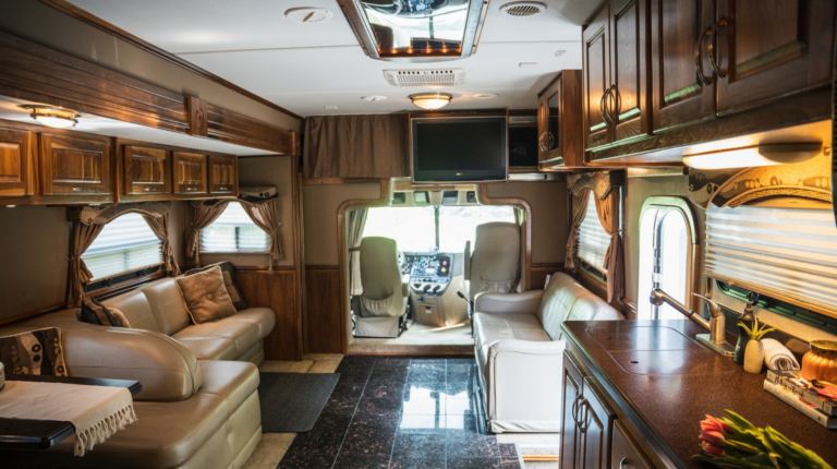Довжина самого тривісного кемпера становить 13,7 м. У салоні автобудинку передбачена простора вітальня з декількома диванами, обідньою зоною, дерев’яними шафами, трьома кондиціонерами і супутниковим телебаченням. Також є повноцінна кухня з мікрохвильовою піччю, подвійним холодильником і раковиною з гарячою водою.