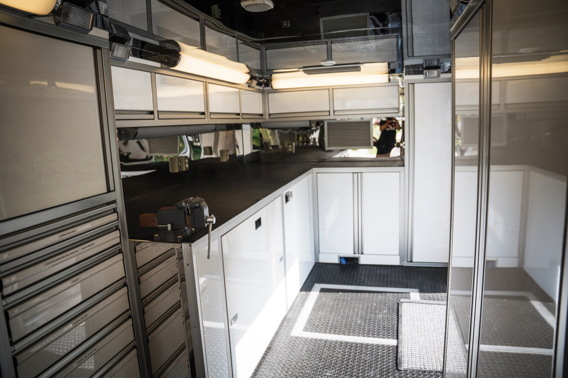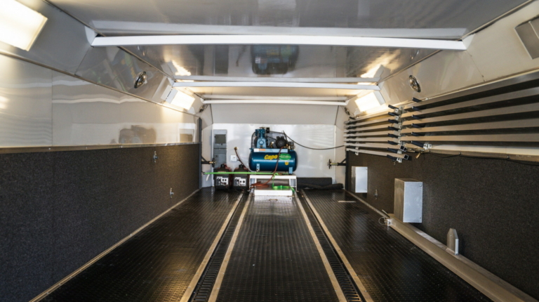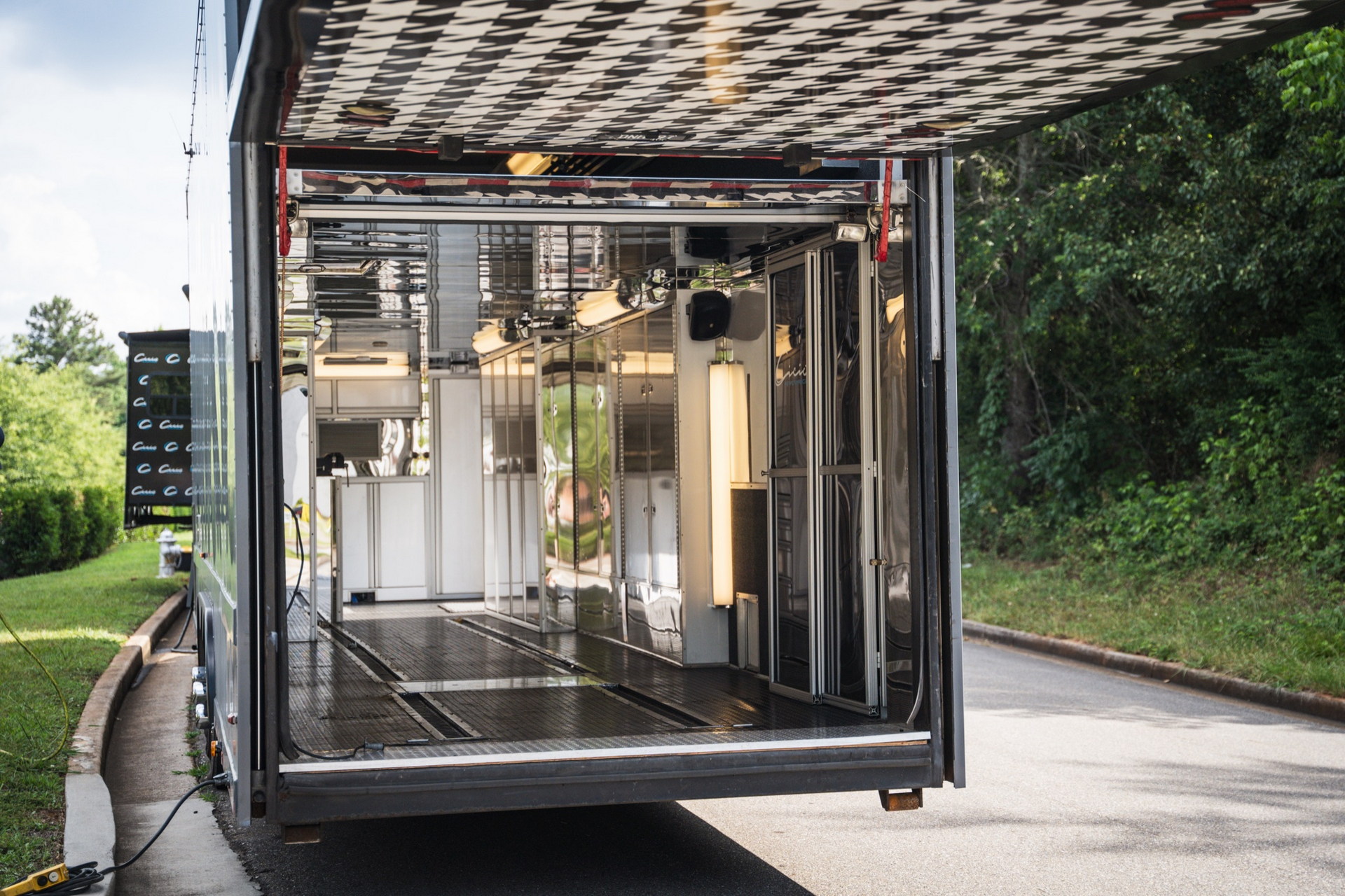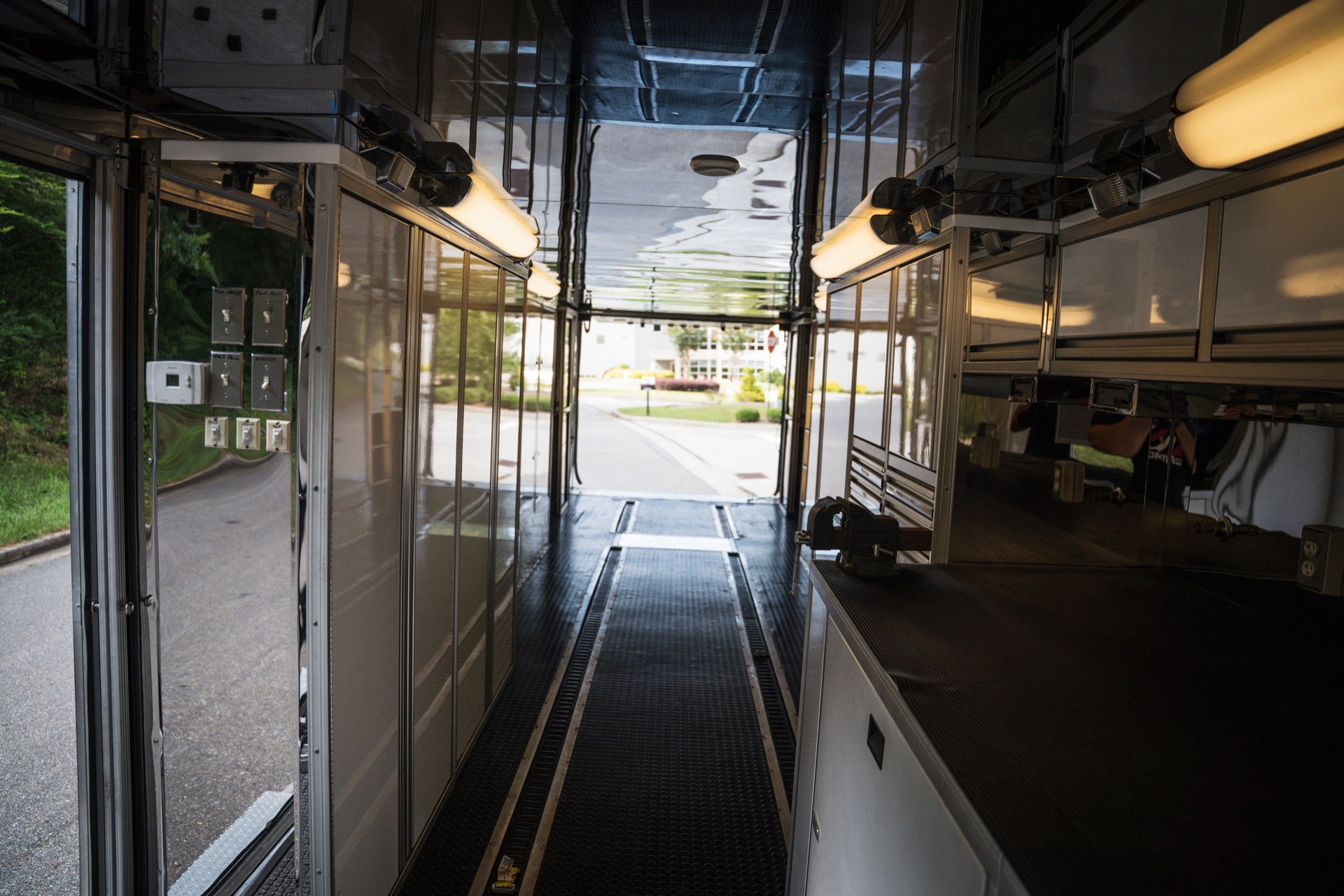 Але головна “фішка” цього “будинку на колесах” — двоповерховий причіп Haulmark завдовжки 11 метрів. У ньому комфортно розмістяться два автомобілі. Також в оголошенні зазначено про наявність місця для трьох гольфкарів. Доступ до основної зони здійснюється через бічні двері або задні двері з вікнами. Гараж обладнаний кондиціонером і всім необхідним для роботи з автомобілем. Нарешті, на даху є оглядовий майданчик, на який можна піднятися східцями.