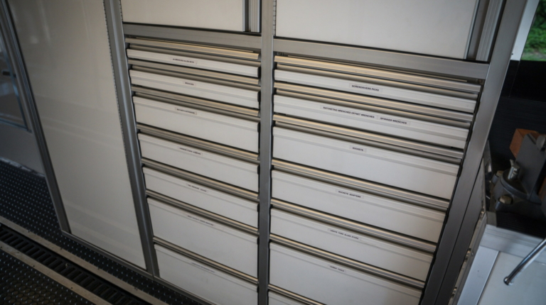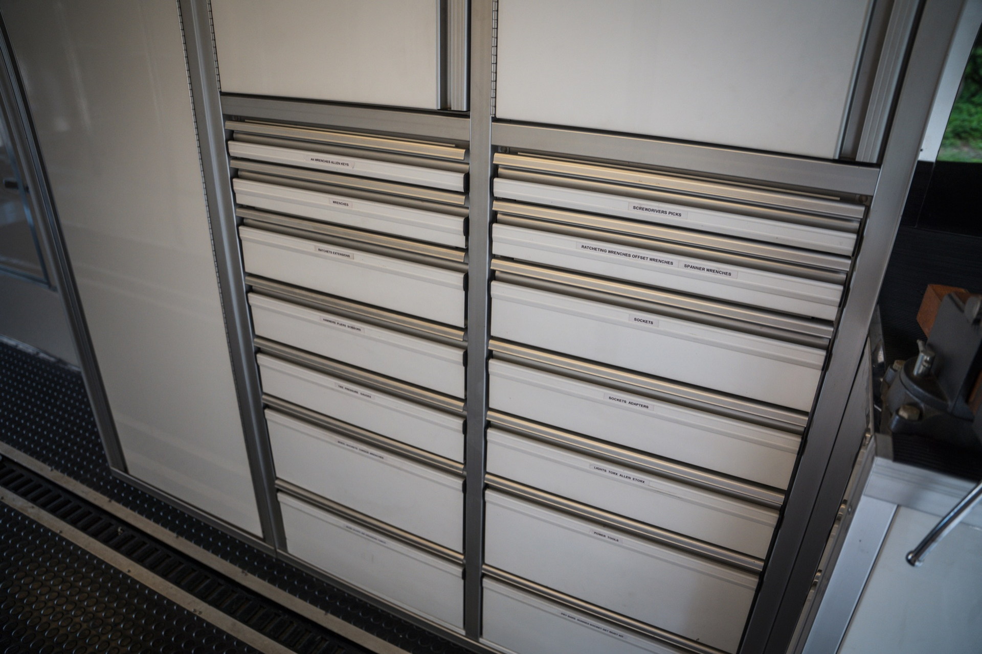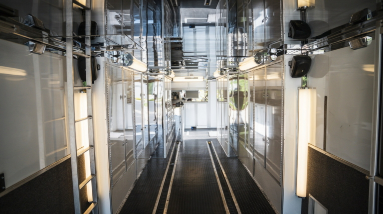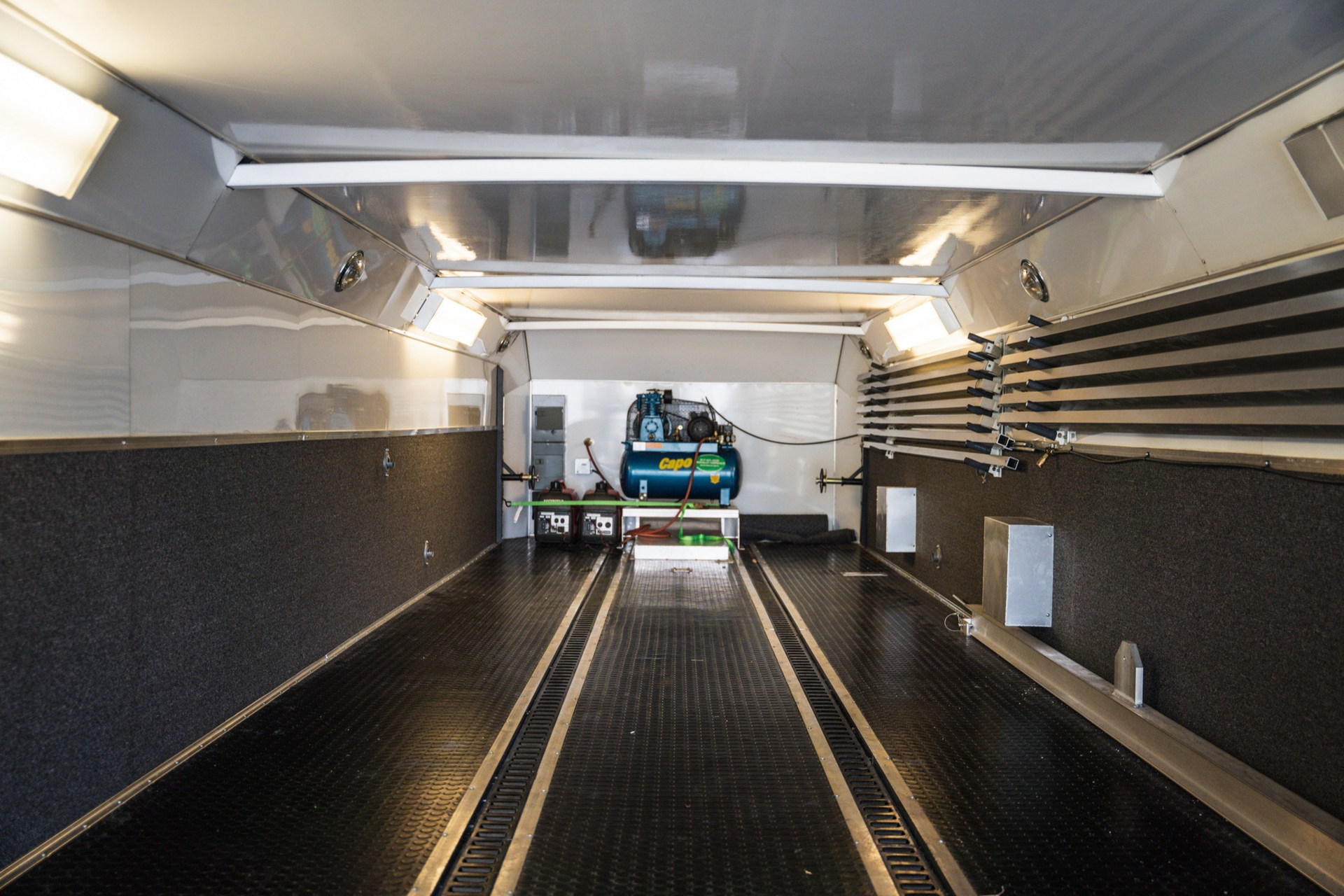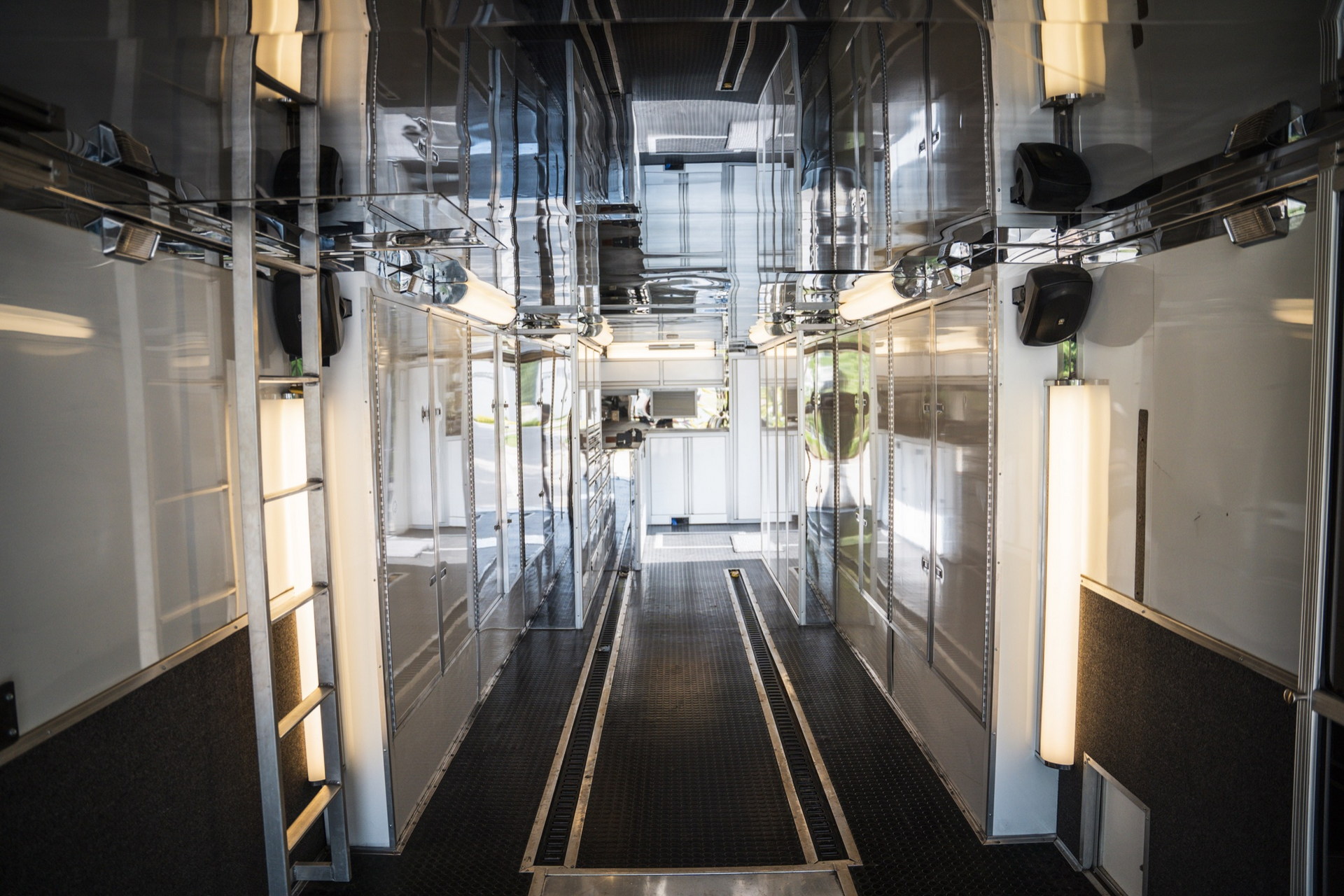 Але головна “фішка” цього “будинку на колесах” — двоповерховий причіп Haulmark завдовжки 11 метрів. У ньому комфортно розмістяться два автомобілі. Також в оголошенні зазначено про наявність місця для трьох гольфкарів. Доступ до основної зони здійснюється через бічні двері або задні двері з вікнами. Гараж обладнаний кондиціонером і всім необхідним для роботи з автомобілем. Нарешті, на даху є оглядовий майданчик, на який можна піднятися східцями.