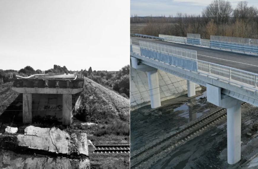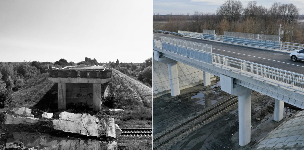 Це вже шостий відновленний міст із 27 зруйнованих у регіоні у лютому-березні 2022 року. Довжина конструкції через залізничні колії — 60 метрів з двома смугами руху. Відновлення шляхопроводу почалося влітку 2023 року. Будівельники розібрали завали зруйної конструкції та відбудували з нуля. Зокрема, звели нові опори, влаштували монолітну прогонову будову та уклали всі шари дорожнього покриття. Також відремонтували підходи до шляхопроводу та встановили мостове огородження й дорожні знаки.