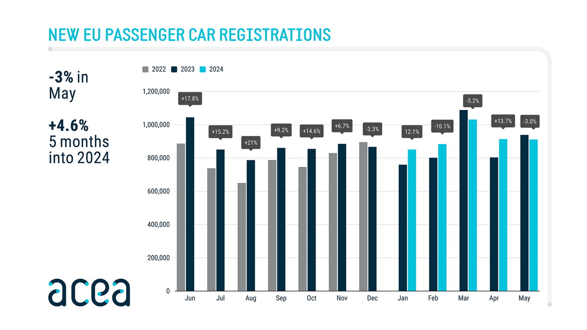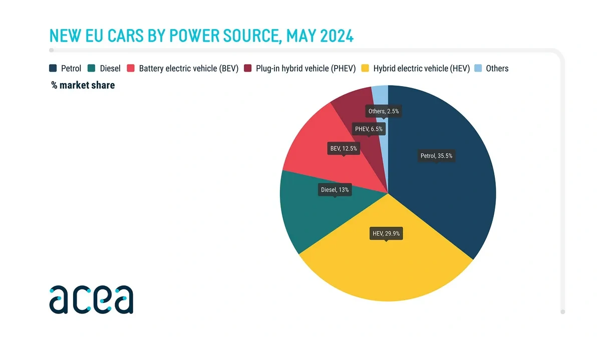 Продаж плагін-гібридів у травні знизився до 14,7%. Найбільше це торкнулося ринків Бельгії (-36,6%) та Франції (-19,4%). У Німеччині приріст становив лише 1,7%. Таким чином, у травні в ЄС було реалізовано всього 59333 плагін-гібридів, що склало 6,5% від загального обсягу продажів.