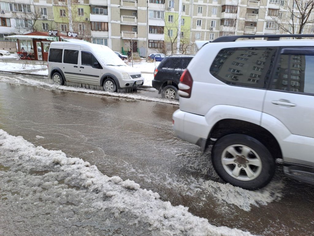 Як повідомляють мешканці Троєщини, потік води не припиняється з ночі. Міжквартальні дороги затоплено повністю. Так як температура повітря на цей момент -4 °C, то вода швидко замерзає, перетворюючи авто на бурульки.