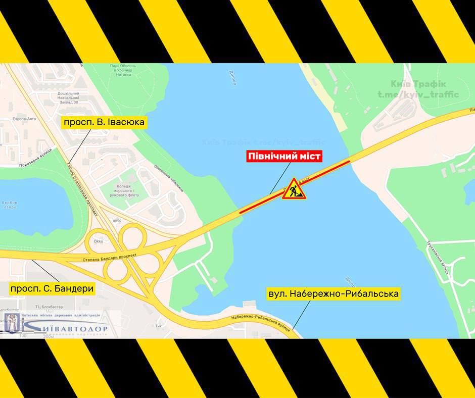 У Києві, у зв’язку з виконанням поточного ремонту крайніх правих смуг, частково обмежать рух транспорту на Північному мосту. Обмеження діятимуть із 08:00 3 червня до 08:00 5 червня.