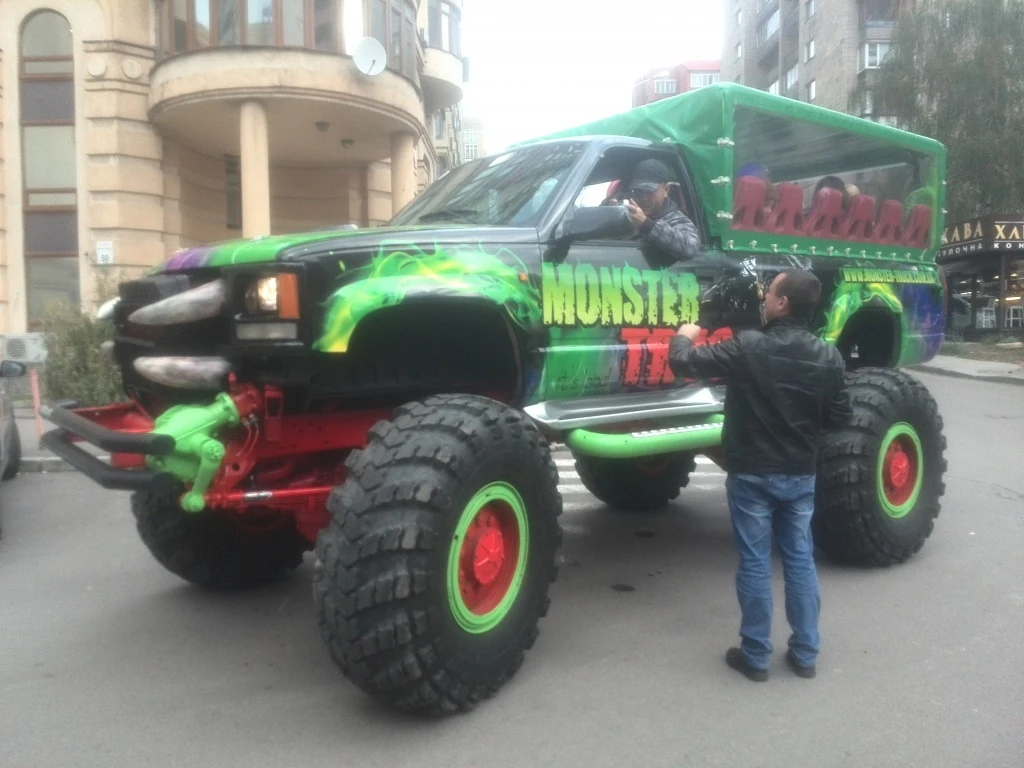 В кузове Monster Truck установлена 12 кресел, есть телевизор с караоке на 4000 песен и светомузыка. Чтобы попасть в салон, откидывается большой трап, почти как в самолет. В холодное время года кузов накрывается тентом с большими окнами.