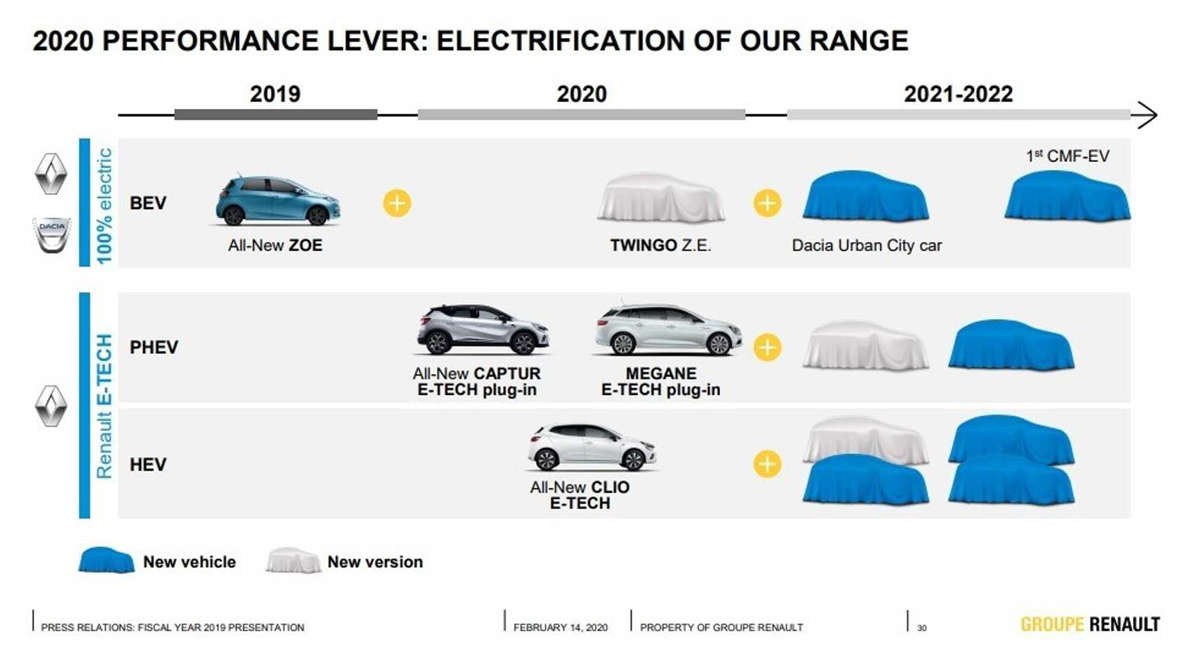 Судячи з представленої Renault таблиці, незабаром на світ з’явиться електрична версія Twingo. Найімовірніше вона виявиться технічним аналогом Smart EQ forfour. Потім очікується вихід нового, поки ще безіменного електромобіля, який умовно називають Dacia Urban City car. Будь-яких деталей або подробиць про новинку немає. Передбачається, що це може бути різновид китайського Renault City K-ZE.