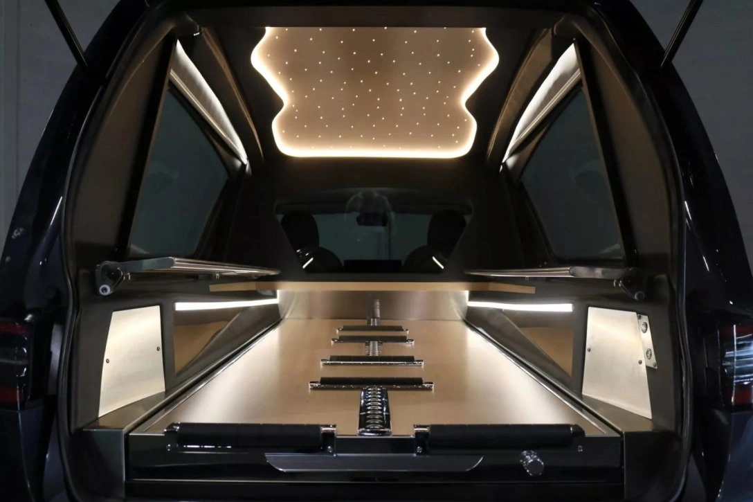 У задній частині електромобіля обладнали відсік із широкою лінією скління та повністю скляним дахом із підсвічуванням у вигляді зоряного неба. Усередині передбачений спеціальний майданчик для встановлення труни та кріплення для букетів квітів. Також є фіранки з електроприводом.