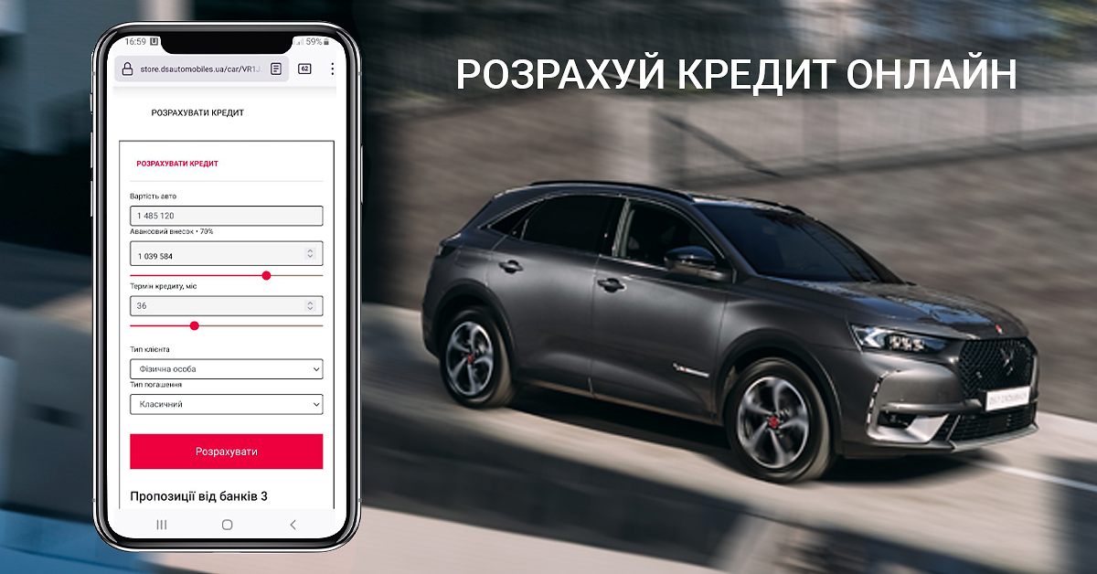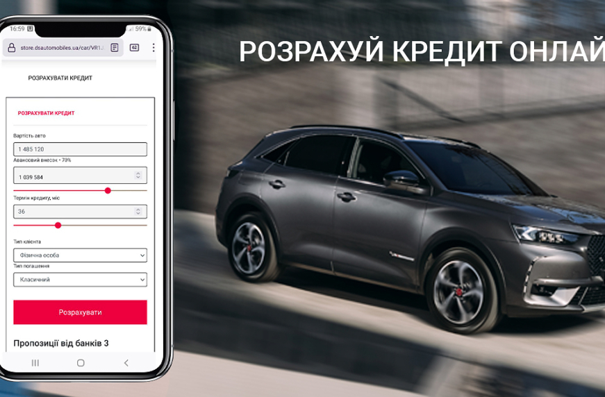Бренд DS Automobiles піклується про максимальний комфорт своїх клієнтів: їх досвід взаємодії з «світом DS» повинен бути винятковим завжди – навіть ще до моменту покупки автомобіля. Тому до функції онлайн вибору автомобіля, тепер додана можливість онлайн розрахунку кредиту для його покупки: порівняння різних пропозицій від банків, розрахунок щомісячних платежів в залежності від першого внеску і терміну кредиту, тд.