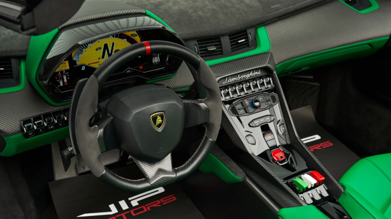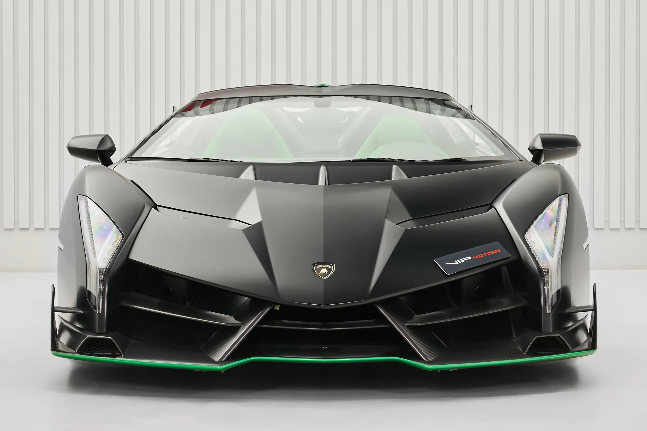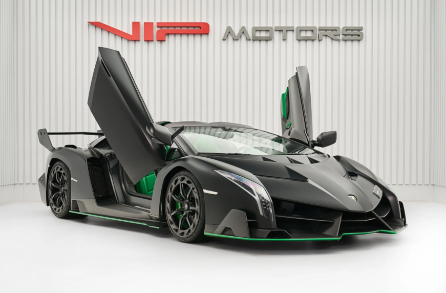 Автосалон VIP Motors у Об’єднаних Арабських Еміратах виставив на продаж один із дев’яти випущених родстерів Lamborghini Veneno. Автомобіль у чорному кузові з деталями з «голого» карбону, зеленою смугою по периметру та зеленими гальмівними супортами планують продати за 8 994 824 євро.