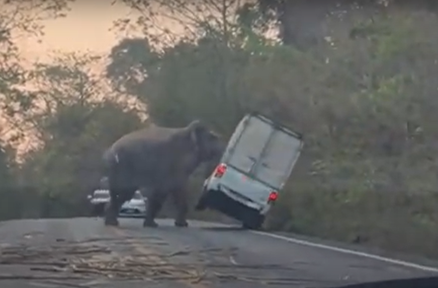 Слон підійшов до машини і почав штовхати її хоботом. Він зупинився тільки після того, як вантажівка впала на бік і скотилася в кущі. Весь цей час водій перебував у салоні. Свідки інциденту викликали службу порятунку, але дика тварина пішла в ліс раніше за їхнє прибуття.