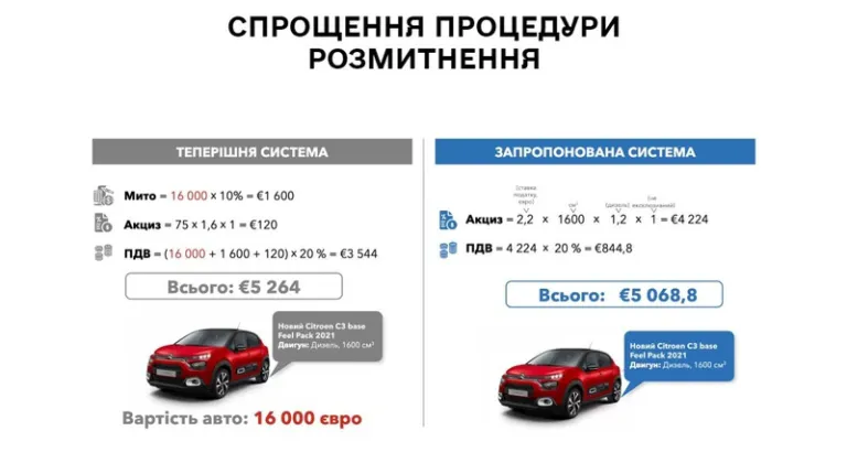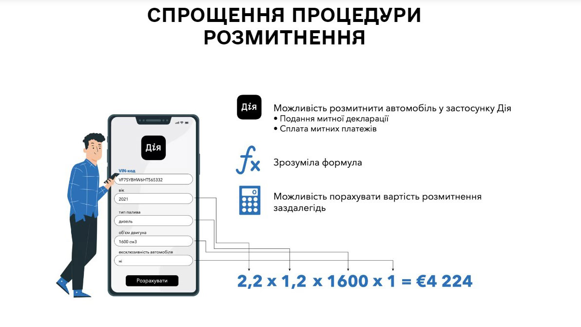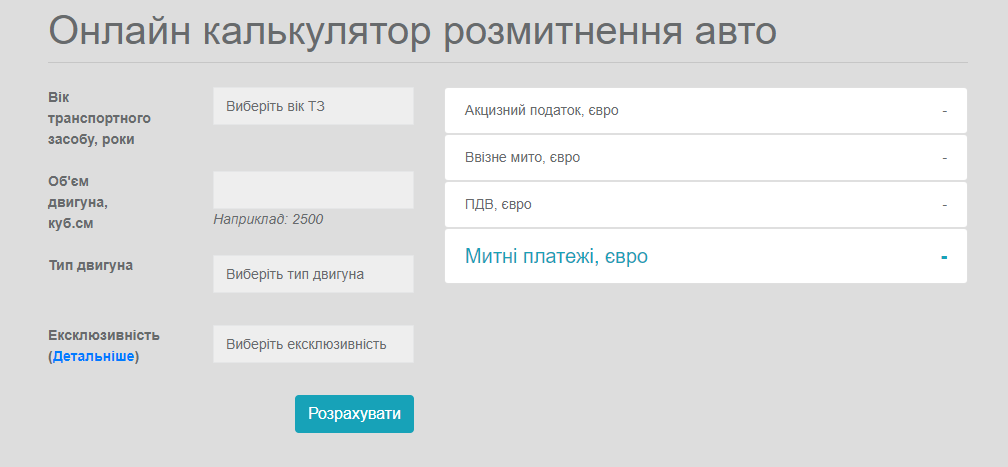 Раніше сервіс був доступний на сайті Державної митної служби. Для розрахунку вартості розмитнення машини у відповідні поля необхідно внести вік ТЗ, тип двигуна, марку, модель, країну походження та рік випуску. Тепер свою версію розробив Офіс простих рішень і результатів при Національній раді реформ. Цей варіант набагато простіший і потребує внесення лише трьох показників: тип двигуна, його об’єм і вік авто.Також потрібно зазначити, чи є автомобіль ексклюзивним (там же можна вивчити список, що стосується дуже потужних і дорогих авто).