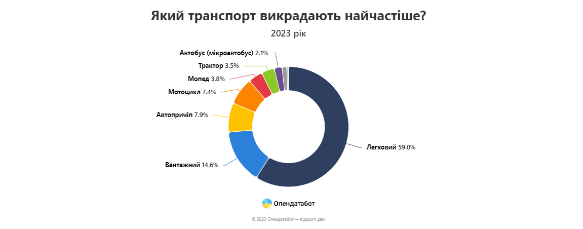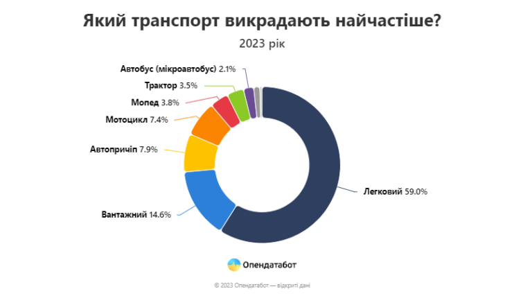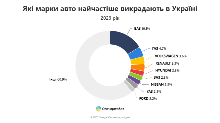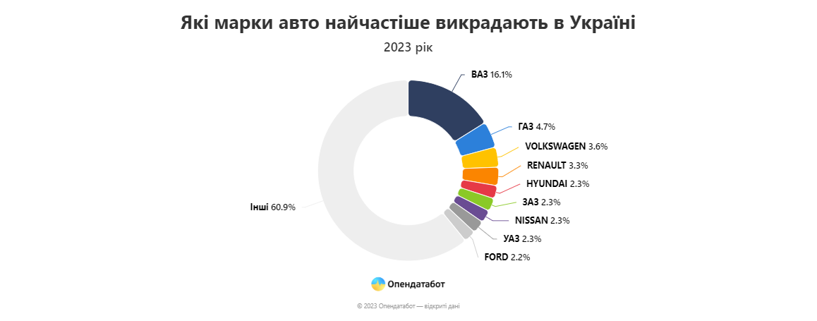 Зловмисники найчастіше викрадали легкові машини та вантажівки. На них припало 59 та 15% від загальної кількості угонів. Найпопулярнішою маркою у 2023 році був ВАЗ. Викрадачі незаконно заволоділи 206 такими авто, що становило 16% від усієї кількості. Також популярними серед викрадачів були машини марки ГАЗ (60 авто), Volkswagen – (46 авто), Renault – (42 авто) та Hyundai – (30 авто).