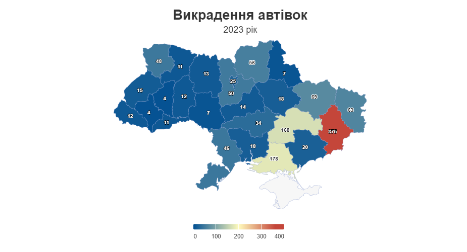 Лідерами за кількістю угонів є прифронтові регіони, а саме Донецька (375 угонів), Херсонська (178 угонів) та Дніпропетровська (168 угону) області. Найменша кількість викрадень авто зафіксована у Тернопільській та Івано-Франківській областях – по 4 викрадання у кожному регіоні.