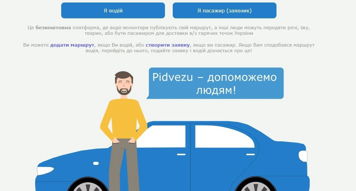 Сервіс дістав назву Pidvezu і є безкоштовним аналогом BlaBlaCar. Однак він дає змогу не тільки перевозити пасажирів, а й передавати через водіїв речі, їжу та тварин. Алгоритм роботи платформи дуже простий.