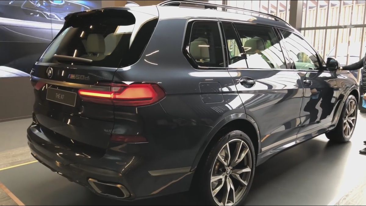 Здесь представлена БМВ Х7 M50d со стилистическим пакетом M Performance. В такой спецификации кроссовер оснащается бамперами агрессивного дизайна, большими колесными дисками и алюминиевыми акцентами вроде корпусов наружных зеркал.