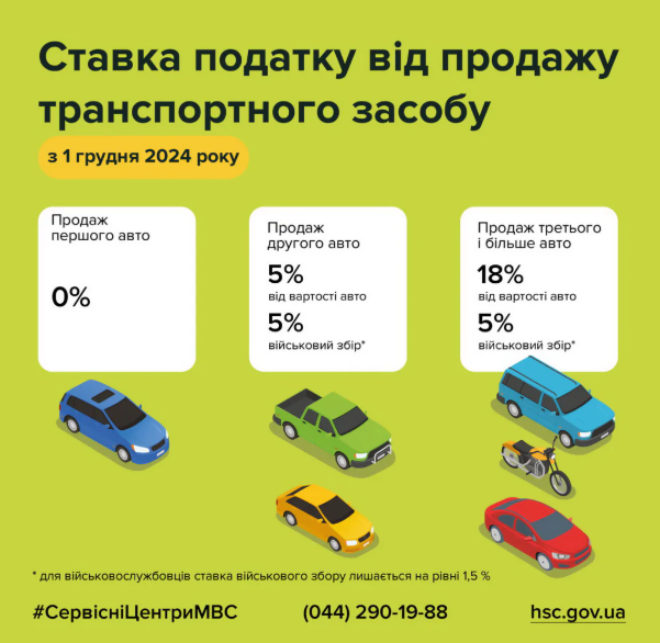 У відомстві зазначили, що із комерційним транспортом ситуація інша. Так, при продажі першого та другого автобуса, вантажівки, причепа, трактора, спецтехніки та іншого рухомого майна стягується податок у 5% та військовий збір 5% від оціночної вартості навіть на першу операцію у році. А ось при продажі третього та наступного такого авто стягується податок у розмірі 18% та військовий збір 5%. Для військовослужбовців ставка збору залишається на рівні 1,5%.