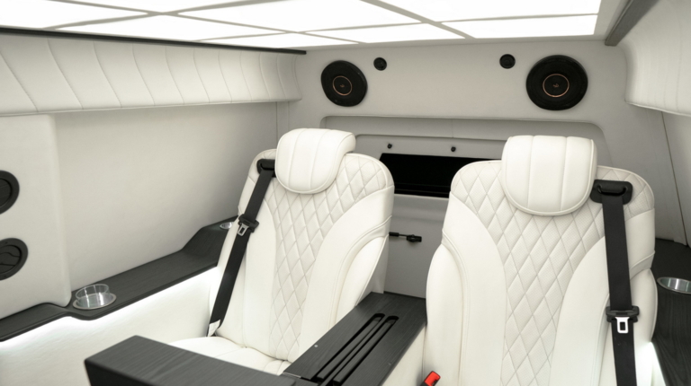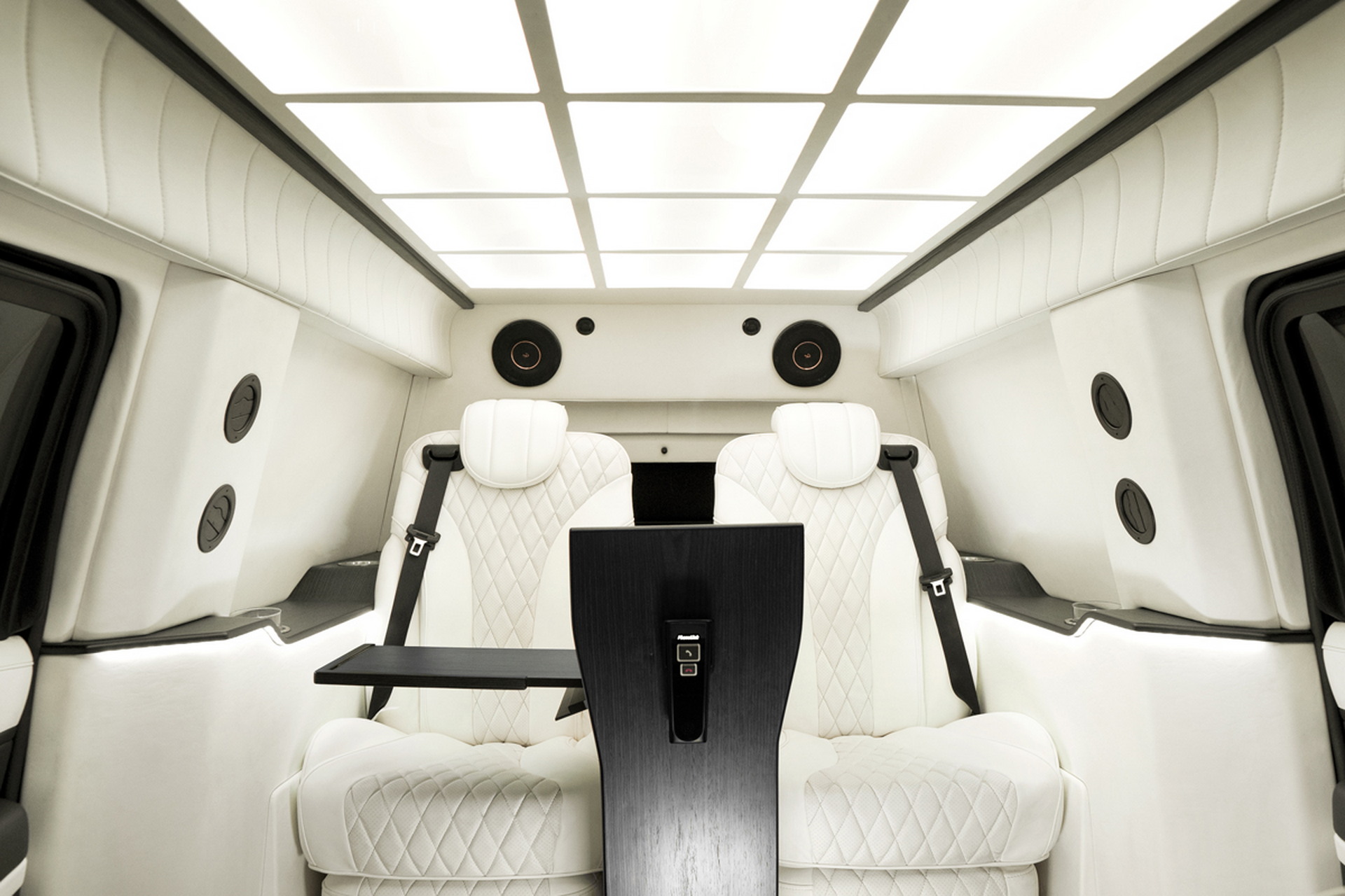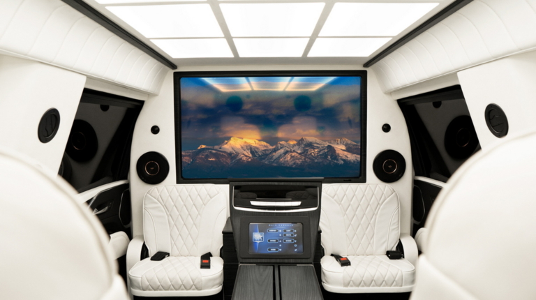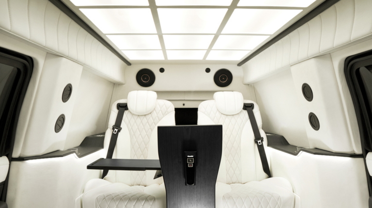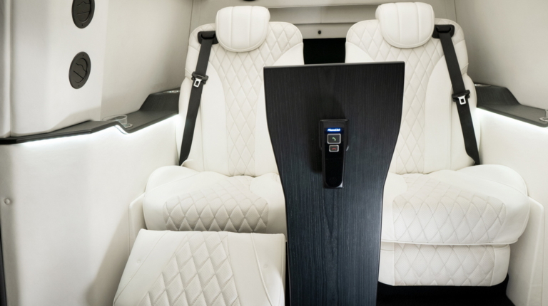 За передніми сидіннями з’явилася розділювальна перегородка з електроприводом, на якій встановлено величезний екран. Він з’єднаний зі звуковою системою з 19 динаміками. Для пасажирів передбачено два капітанських крісла з функцією масажу, а поруч із дверима облаштували два відкидних додаткові місця для охорони. Також є складані столики для роботи VIP-персон. В оздобленні використано преміальні матеріали.