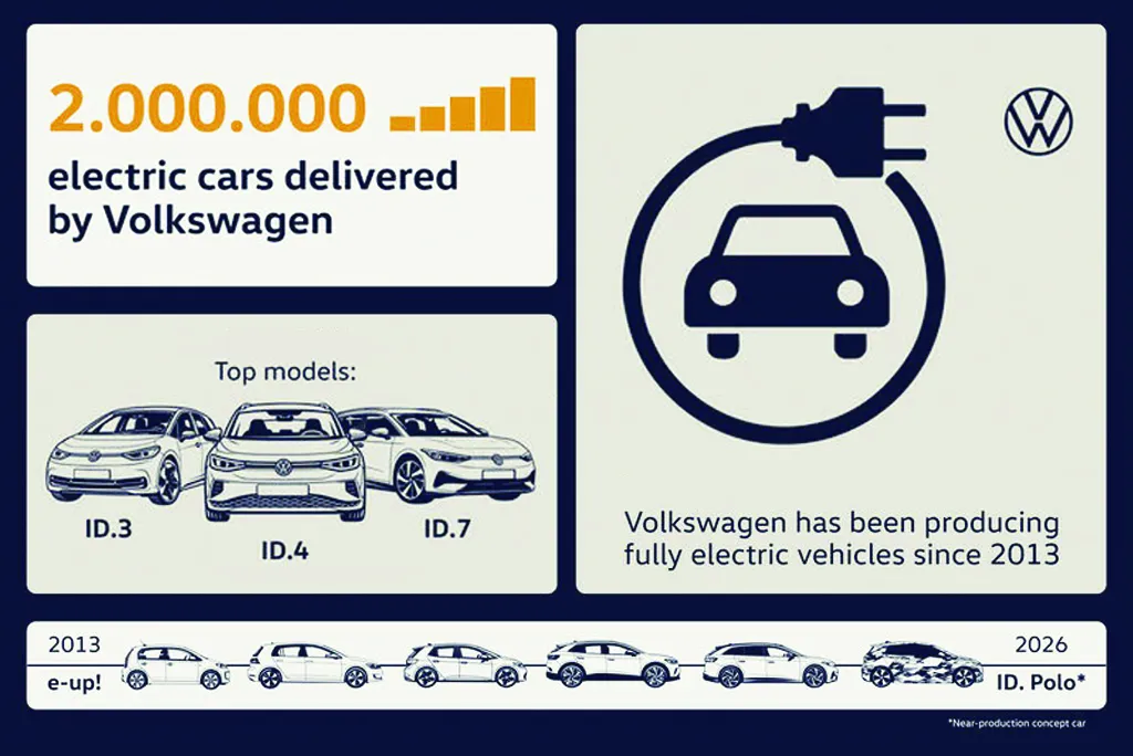 Volkswagen розпочав свій шлях в електромобільності у 2013 році із запуском e-up! і з того часу систематично розширює модельний ряд. Два мільйони електромобілів (BEV) включають не тільки моделі з сімейства ID., але та електричні попередники, такі як e-up! та e-Golf.