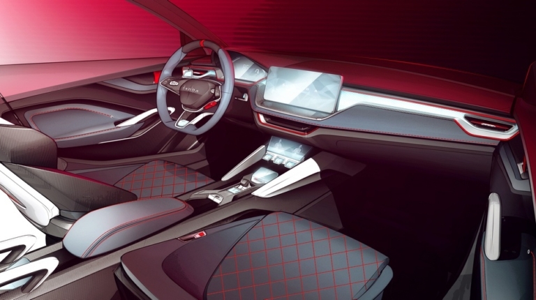 Разумеется, приборная панель серийного автомобиля не будет отделана кожей, а сиденья скорее всего не получат стеганную обивку. Тем не менее, в интерьере будет применена очень схожая «многоэтажная» структура. Обратите внимание, что центральные воздуховоды климатической системы теперь переместились под экран, такое же решение мы наверняка увидим в Skoda Rapid 2019.