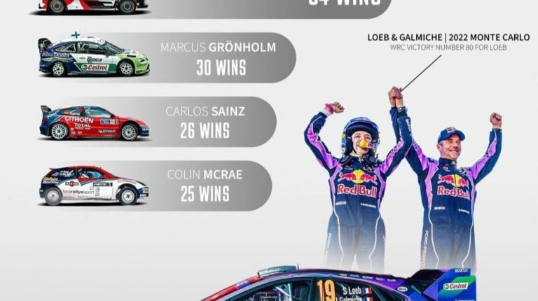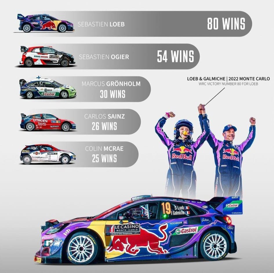 Але про них більш акцентовано якось наступного разу. Зараз же восьма (а може й 9-а перемога, якщо взяти до уваги незараховану спробу-2002) на 90-ому «Ралі Монте-Карло» принесла 80-у перемогу Себастьєну Льобу (він нарешті випередив свого колишнього штурмана за цим показником) на 70-у річницю Французької Федерації Автомобільного Спорту FFSA у 50-ому ювілейному Чемпіонаті Світу WRC. І так, тепер він старший за Джузеппе Фаріну чи Хуана-Мануеля Фанхіо за часів їх останніх перемог у Формулі 1. Ви за нього можете не вболівати, але не радіти успіхом видатного спортсмена точно не можете! Ось у чому полягає феномен Себастьєна Льоба.