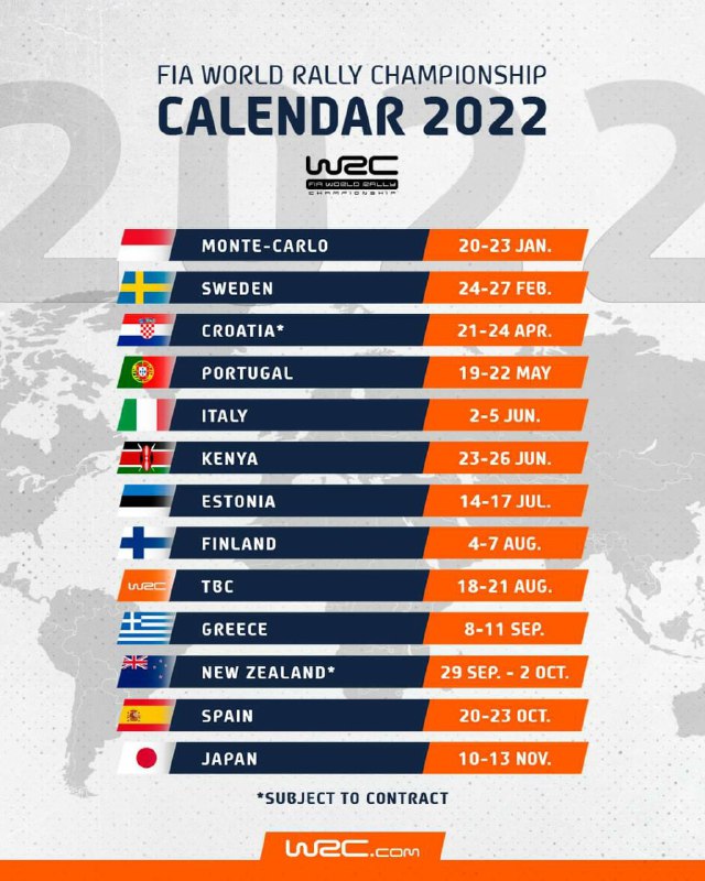 На відміну від інших гоночних серій, немає приросту і в календарі турніру. Про повернення до колишніх 16 раундів не йдеться, проте анонсовано 13 змагань. Традиційний початок сезону в Монте-Карло і Швеції, асфальтова Хорватія та 5 поспіль гравійних етапів Португалією, Сардинією, Кенією, Естонією і Центральною Фінляндією. Після чого у серпні заплановано невідомий асфальтований етап. Колись тут могла б бути Німеччина, але ніщо не заважає повернути Ірландію під загальним брендом Сполученого Королівства. У заключній частині сезону повернуті Акрополь, Нова Зеландія, Іспанія і Японія.